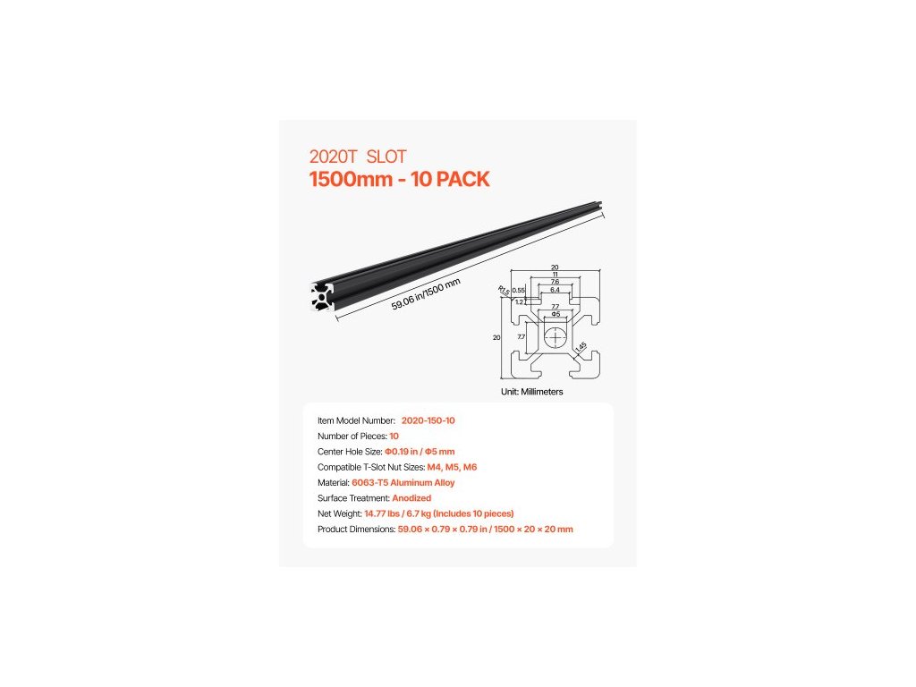 Počet kusů: 10,Číslo modelu položky: 2020-150-10,Povrchová úprava: eloxovaná,Materiál: Hliníková slitina 6063-T5,Kompatibilní velikosti T-drážkových matic: M4, M5, M6,Rozměry produktu: 59,06 x 0,79 x 0,79 palce / 1500 x 20 x 20 mm,Velikost středového otvoru: ?0,19 palce / ?5 mm, Čistá hmotnost: 14,77 lbs / 6,7 kg (obsahuje 10 kusů)