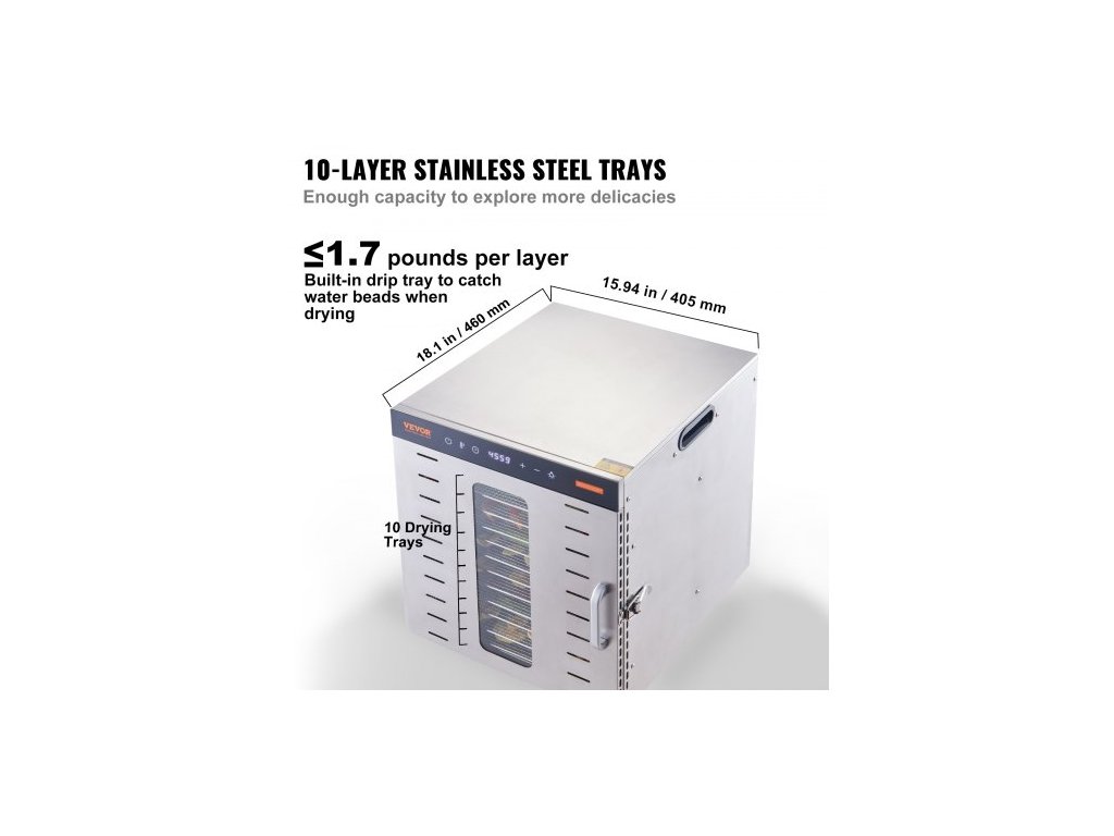Certifikace: FDA, Časový rozsah: 0,5–48 h, Celkové rozměry stroje: 460 x 420 x 465 mm, Napětí: 220 V/50 Hz, Číslo modelu: SS-10X, Materiál: nerezová ocel, Čistá hmotnost: 11,3 kg, Příkon: 1000 W, Teplotní rozsah: 30–90 °C, Velikost každého tácu: 14,8 x 11,2 palce / 377 x 285 mm
