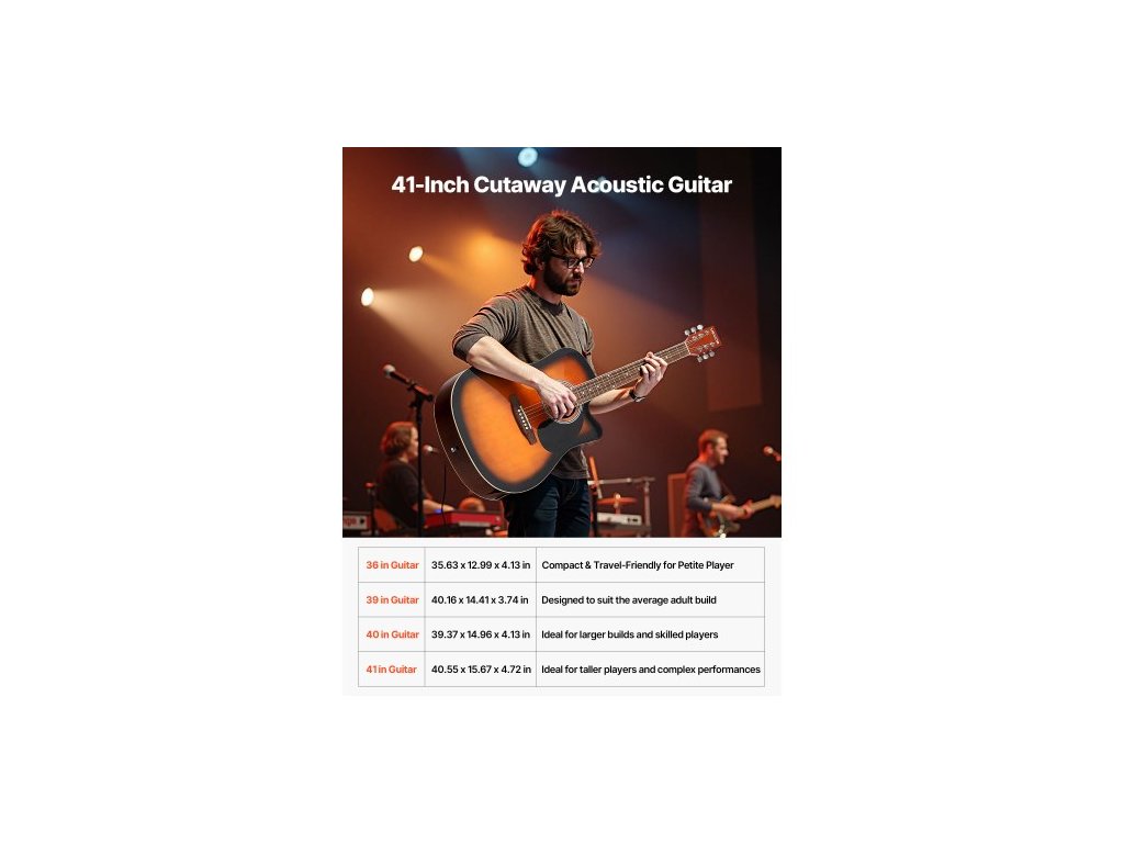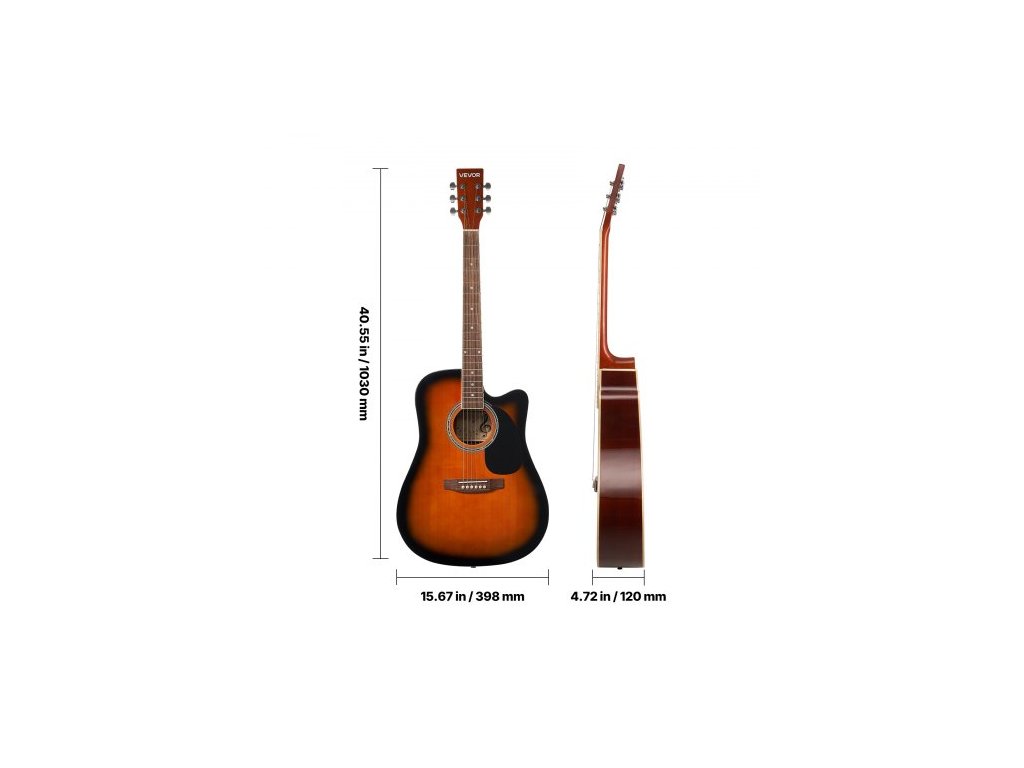 Rozměr: 41 palců/1041,4 mm,Barva: Sunburst,Číslo modelu položky: FG068C-41SB,Styl: Akustická kytara Cutway,Materiál: Smrková vrchní deska, mahagonová zadní deska, hmatník z palisandru,Rozměry výrobku: 40,55 x 15,67 x 4,72 palce/1030 x 398 x 120 mm,Čistá hmotnost: 6,33 lbs/2,87 kg