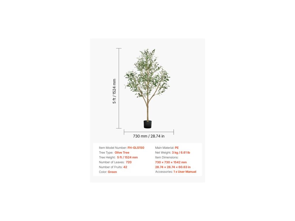 Výška stromu: 5 stop / 1524 mm,Rozměry položky (D x Š x V): 730 x 730 x 1540 mm / 28,74 x 28,74 x 60,63 palce,Barva: Zelená,Číslo modelu položky: FH-GLS150,Typ stromu: Olivovník,Počet plodů: 42,Počet listů: 720,Čistá hmotnost: 3 kg / 6,61 lb,Hlavní materiál: PE (polyethylen)