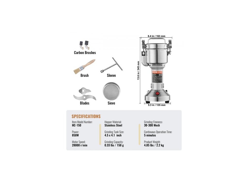 Otáčky motoru: 28000 ot/min,Rozměry výrobku (D x Š x V): 6,4 x 5,3 x 13,6 palce / 163 x 135 x 345 mm,Materiál zásobníku: nerezová ocel 403,Rozměry mlecí nádrže: 4,5 x 4,1 palce / 11,5 x 10,5 cm,Číslo modelu: HC-150,Hmotnost výrobku: 4,85 lbs / 2,2 kg,Mletí: 0,33 lbs / 150 g, Doba nepřetržitého provozu: 5 minut, Jemnost mletí: 30-300 mesh, Výkon: 850 W