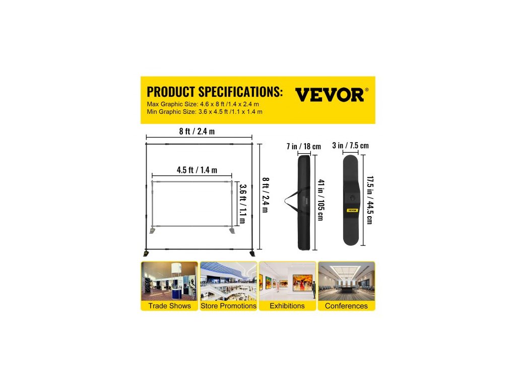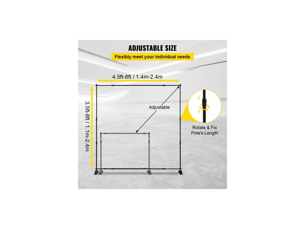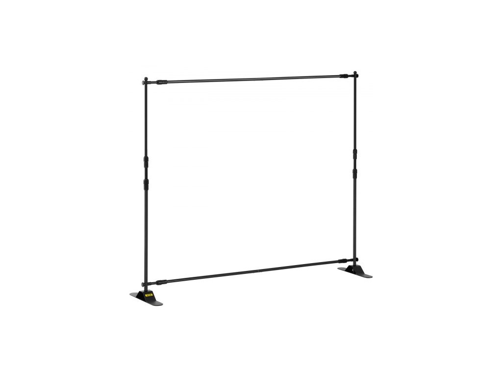 Rozsah šířky: 1,4 m - 2,4 m,Tloušťka stěny trubky: 1 mm,Nosnost: 6 kg,Výškový rozsah: 1,1 m - 2,4 m,Rozměry základny (D x Š): 45 cm x 7,6 cm,Barva: Černá,Minimální velikost grafiky (Š x V): 1,1 m x 1,4 m,Hmotnost výrobku: 5,4 kg,Materiál rámu: Hliník, Max. velikost grafiky (Š x V): 1,4 m x 2,4 m, Základní materiál: Železo