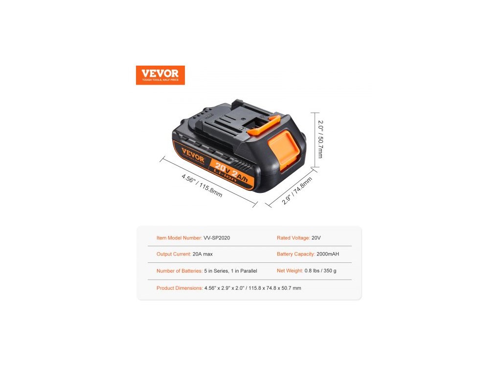 Kapacita baterie: 2000 mAH,Počet baterií: 5 v sérii, 1 paralelně,Výstupní proud: max. 20 A,Číslo modelu položky: VV-SP2020,Rozměry produktu: 45,6" x 2,9" x 2,0" / 115,8 x 74,8 x 50,7 mm,Čistá hmotnost: 0,8 lbs / 350 g,Jmenovité napětí: 20 V