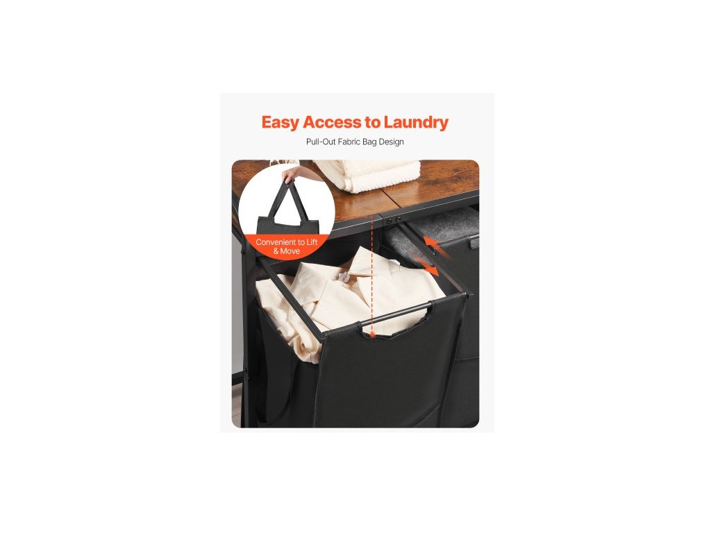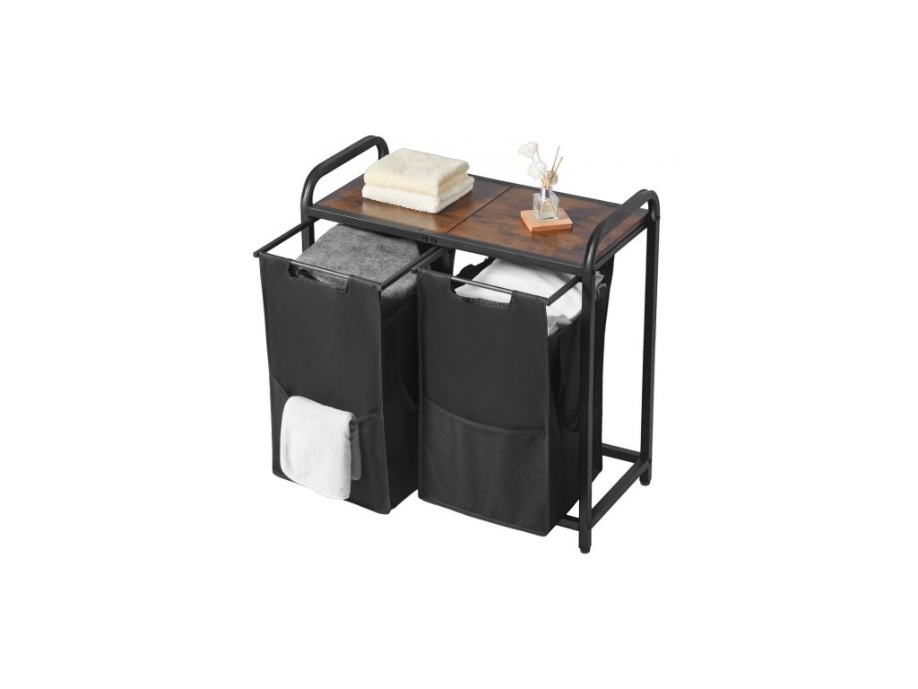 2dílný třídič prádla, velký koš na prádlo s kovovým rámem a dřevěnou deskou, volně stojící úložné koše s výsuvnými sáčky z oxfordské látky 600D na špinavé prádlo, koupelna