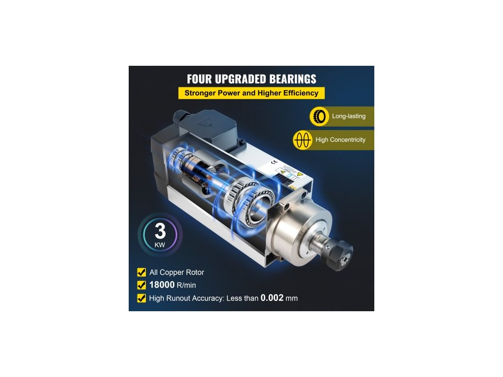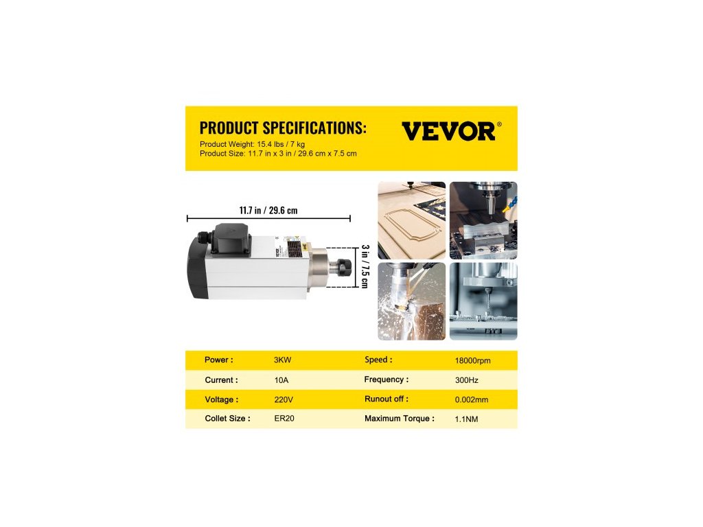 Maximální točivý moment: 1,1 NM,Otáčky: 18000 ot./min,Rozměry výrobku: 7,5 x 29,6 cm,Napětí: 220 V,Frekvence: 300 Hz,Házení: Méně než 0,002 mm,Výkon: 3 kW,Hmotnost: 7 kg