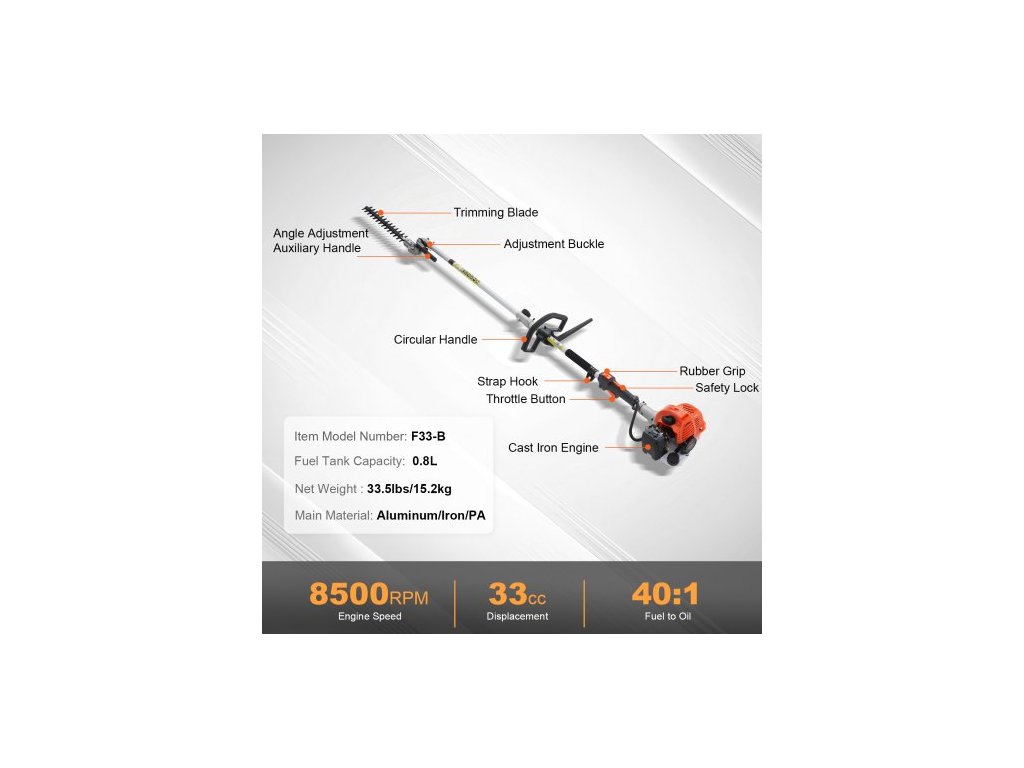 Hlavní materiály: Hliník/Železo/PA,Otáčky kotouče: 6500 ot/min,Otáčky motoru: 8500 ot/min,Číslo modelu položky: F33-B,Objem palivové nádrže: 0,8 l,Čistá hmotnost: 33,5 lbs/15,2 kg,Zdvihový objem: 33 ccm