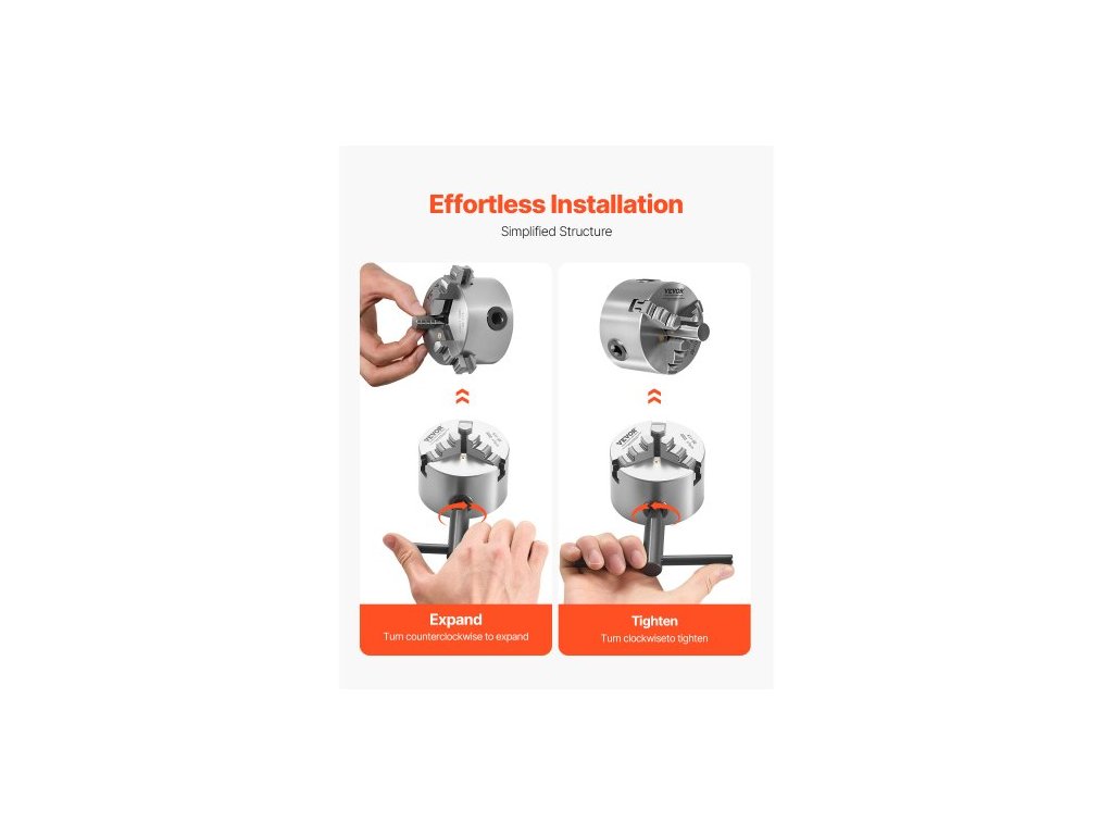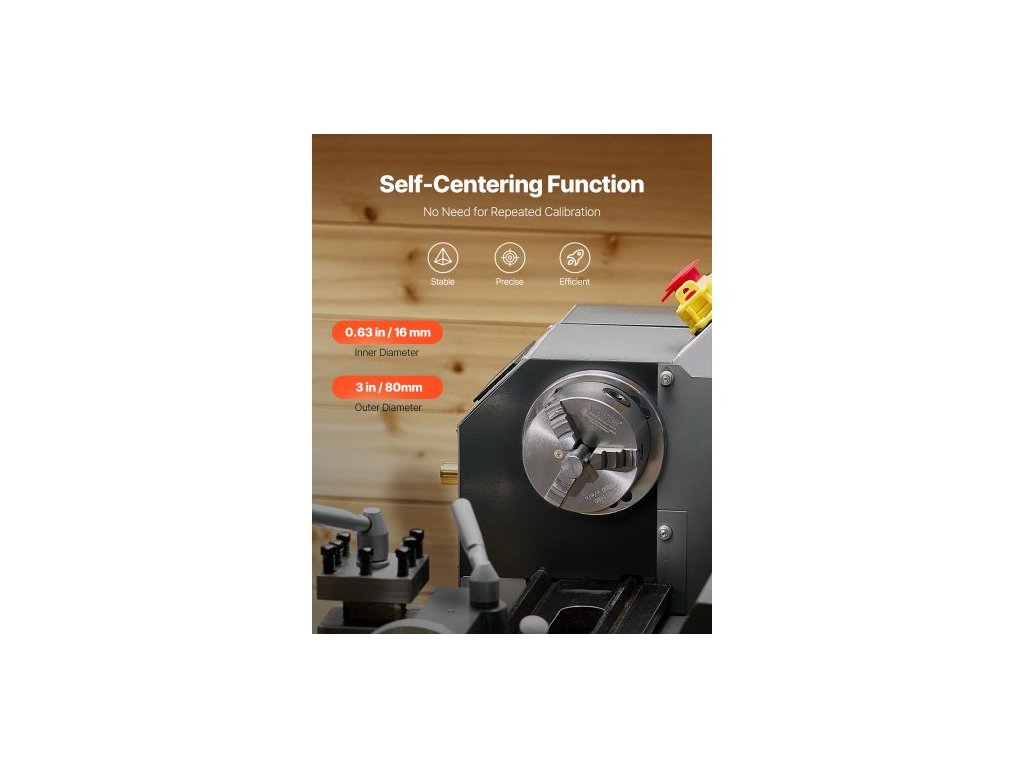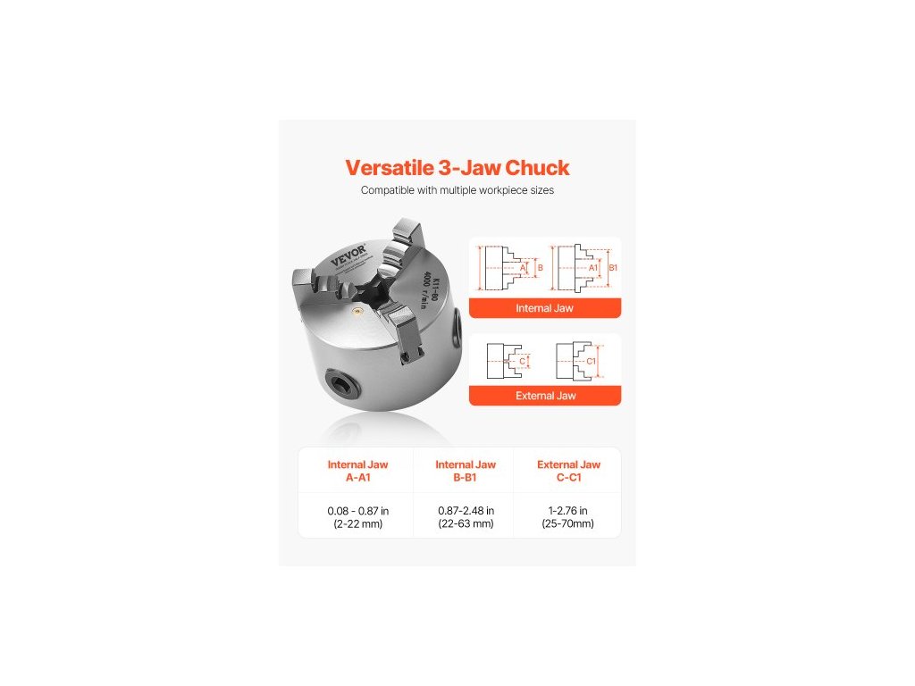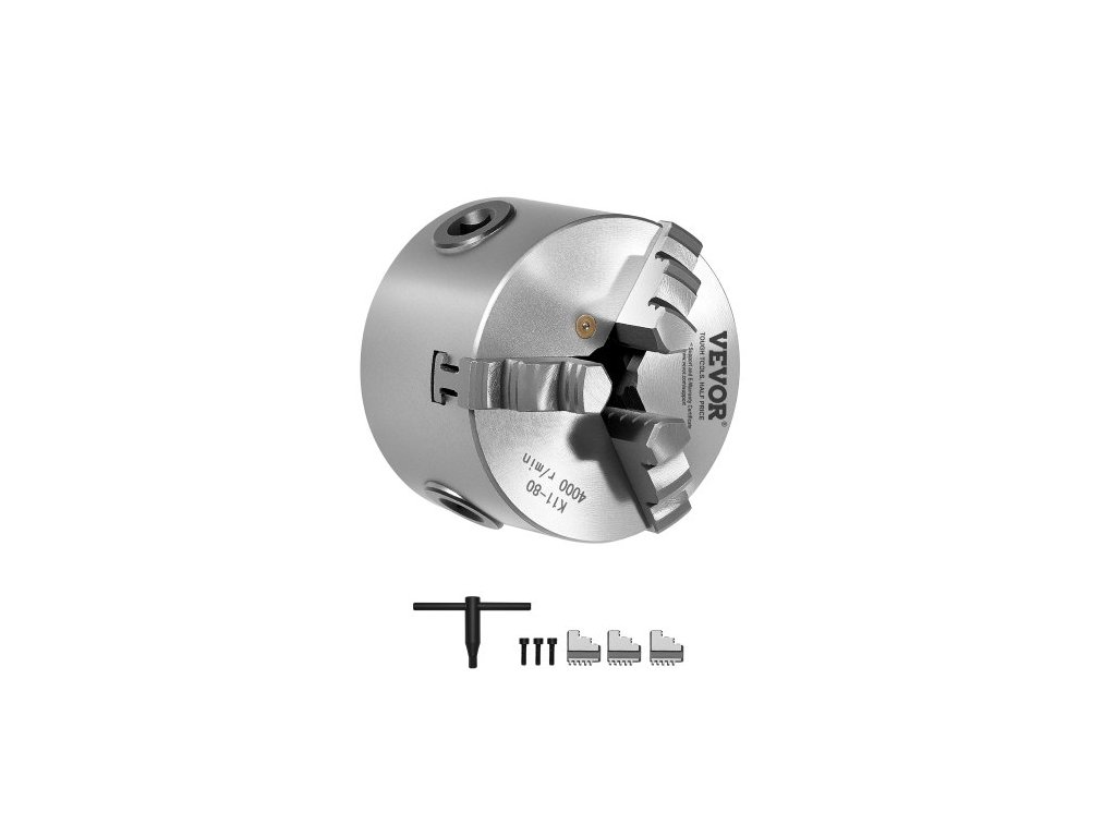 3čelisťové soustružnické sklíčidlo , 80 mm (3 palce), samostředicí sklíčidlo, upínací rozsah 2–63 mm (0,08–2,48 palce) s upevňovacími šrouby s T-klíčem, otočné čelisti, materiál HT300, vnitřní a vnější pro soustruh na dřevo a kov