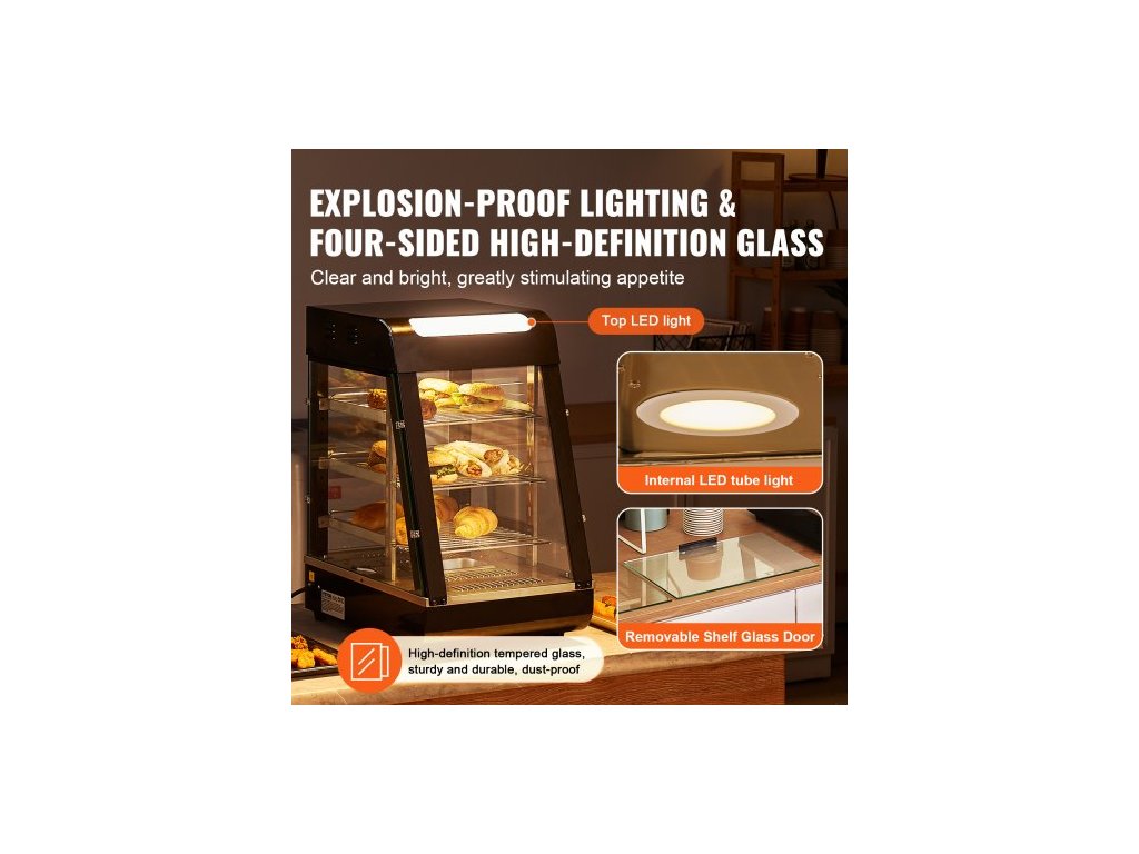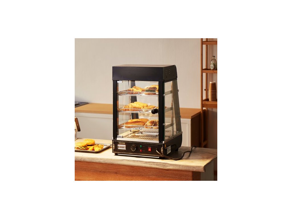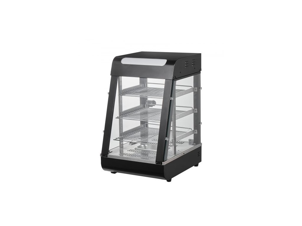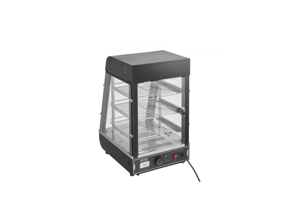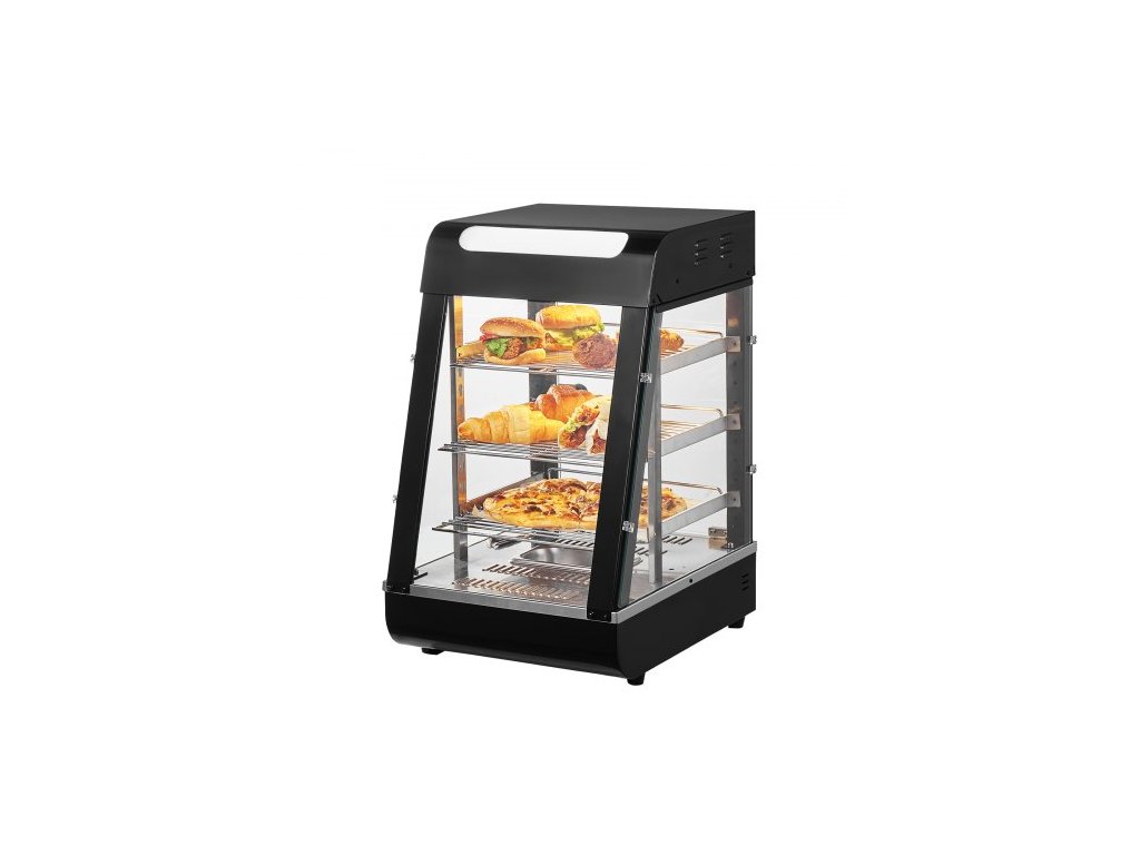 3patrový komerční ohřívač jídla, 1000W ohřívač jídla s osvětlením, nastavitelná police a displej teploty, ohřev párou 30°C~85°C, 57L na hamburgery, pizzu, chléb, smažené kuře
