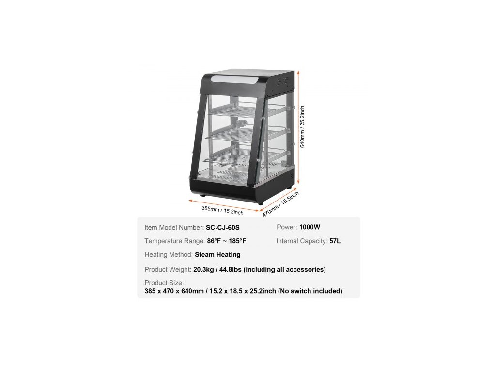 Vnitřní objem: 57L,Číslo modelu položky: SC-CJ-60S,Hmotnost výrobku: 44,8 lbs / 20,3 kg,Teplotní rozsah: 30°C~85°C,Způsob ohřevu: Ohřev párou,Výkon: 1000W,Rozměry výrobku: 15,16 x 18,50 x 25,20 palců / 385 x 470 x 640 mm (bez vypínače)