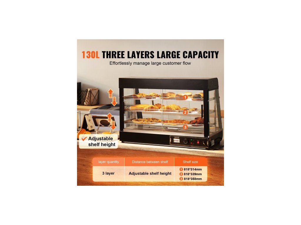 3patrový komerční ohřívač jídla, 1500W ohřívač jídla s osvětlením, nastavitelná police a displej teploty, ohřev párou 30°C~85°C, 130L na hamburgery, pizzu, chléb, smažené kuře