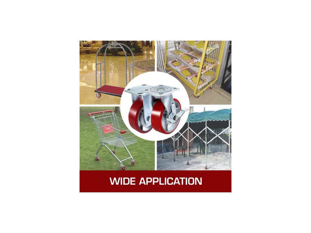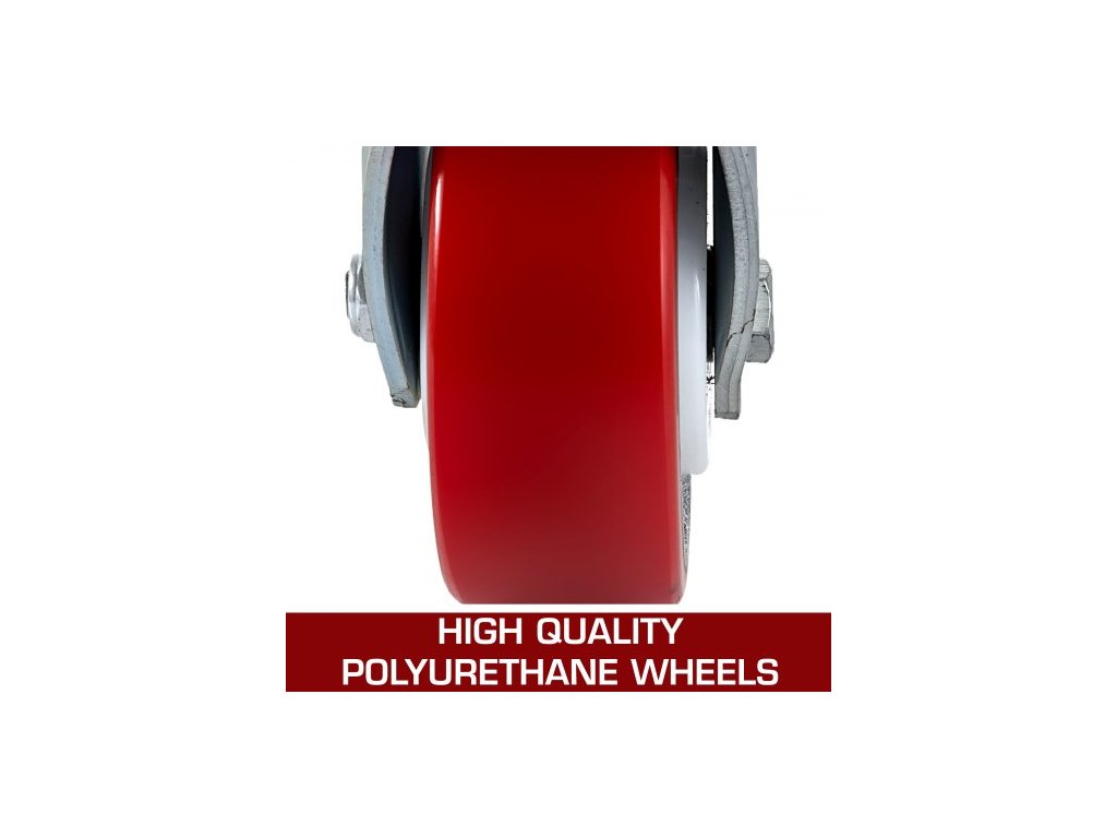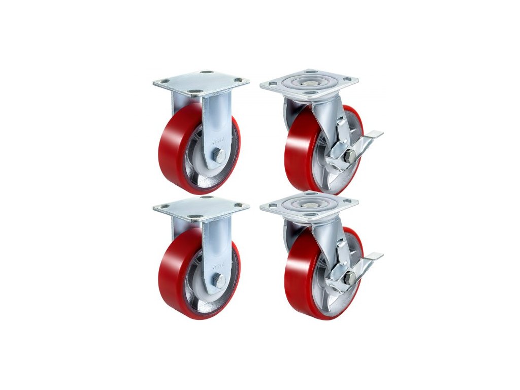 4 kolečka 15,24 x 5,08 cm, 2 pevná a 2 otočná kolečka s boční brzdou, polyuretanová železná deska, nosnost 453,59 kg na kolo