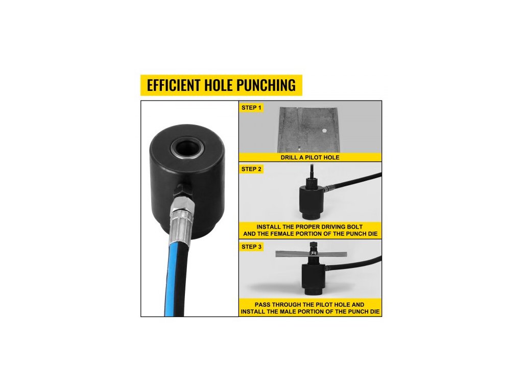 Maximální tloušťka nerezové oceli: 2 mm/0,08 palce/13 ga,Materiál děrovací matrice: Ocel,Zdvih: 25 mm / 1",Celková hmotnost: 11 kg/25 lbs,Materiály děrovacích matric: Ocel, nerezová ocel, mosaz, měď, hliník (pouze měkké slitiny, nepoužít s 7075 nebo jinými superslitinami), sklolaminát, plast a další.,Děrovací matrice: 22, 27,5, 34, 43, 49, 60 mm (0,866", 1,08", 1,34", 1,7", 1,93", 2,36"), Rozměry: 430 x 260 x 260 mm / 17 x 10 x 10 palců, Maximální tloušťka oceli: 3,2 mm / 0,13 palce / 11 ga, Maximální tlak: 10 tun, Tažné čepy: 3,1" délka x 0,31" průměr a 3,2" délka x 0,3" průměr / 7,9 cm délka x 0,79 cm průměr a 8,1 cm délka x 0,76 cm průměr (Kompatibilní s GREENLEE a dalšími domácími děrovacími nástroji)