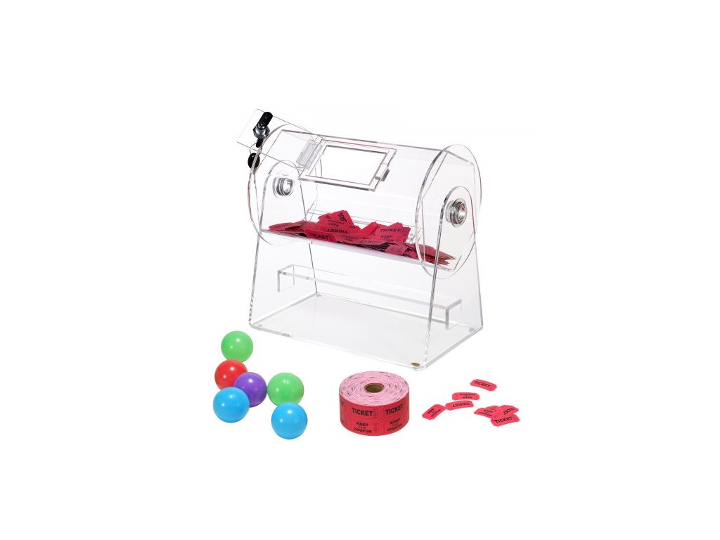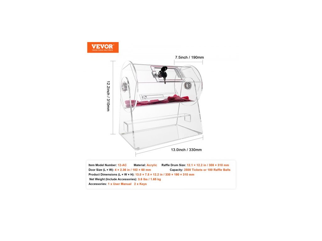 Rozměry tombolového bubnu: 12,1 x 12,2 palce / 308 x 310 mm,Kapacita: 2500 losů nebo 100 tombolových koulí,Číslo modelu položky: 12-AC,Materiál: Akryl,Čistá hmotnost (včetně příslušenství): 3,6 lbs / 1,65 kg,Rozměry výrobku (D x Š x V): 13,0 x 7,5 x 12,2 palce / 330 x 190 x 310 mm, Rozměry dveří (D x Š): 102 x 60 mm