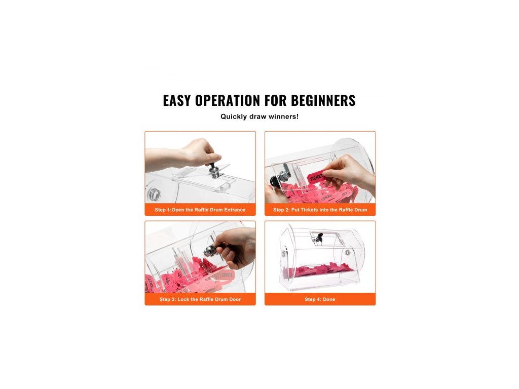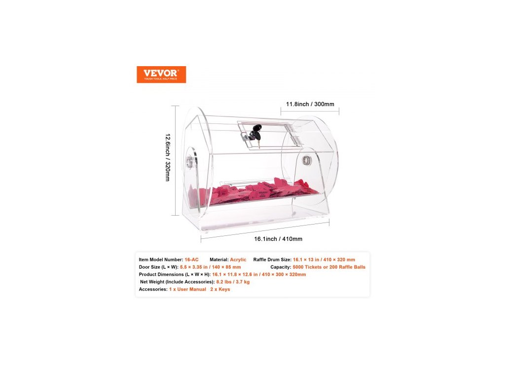 Rozměry tombolového bubnu: 16,1 x 13 palců / 410 x 320 mm,Kapacita: 5000 losů nebo 200 tombolových koulí,Číslo modelu položky: 16-AC,Materiál: Akryl,Čistá hmotnost (včetně příslušenství): 8,2 lbs / 3,7 kg,Rozměry výrobku (D x Š x V): 16,1 x 11,8 x 12,6 palců / 410 x 300 x 320 mm, rozměry dveří (D x Š): 5,5 x 3,35 palce / 140 x 85 mm