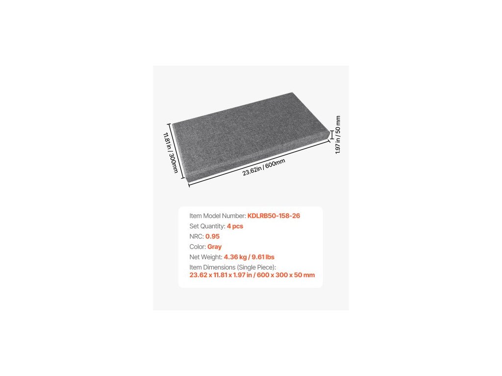 Množství v sadě: 4 ks,Barva: Šedá,Číslo modelu položky: KDLRB50-158-26,Rozměry položky (jeden kus): 600 x 300 x 50 mm / 23,62 x 11,81 x 1,97 palce,Čistá hmotnost: 4,36 kg / 9,61 lbs,NRC: 0,95,Hlavní materiál: 100% bílá sklolaminátová vložka,Zadní lepidlo: 3M, Samolepicí