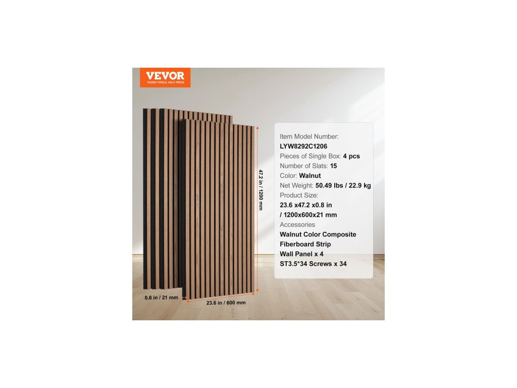 Počet kusů v jedné krabici: 4 ks,Barva: ořech,Číslo modelu položky: LYW8292C1206,Počet lamel: 15,Čistá hmotnost: 50,49 lbs / 22,9 kg,Rozměry výrobku: 23,6 x 47,2 x 0,8 palce / 1200 x 600 x 21 mm
