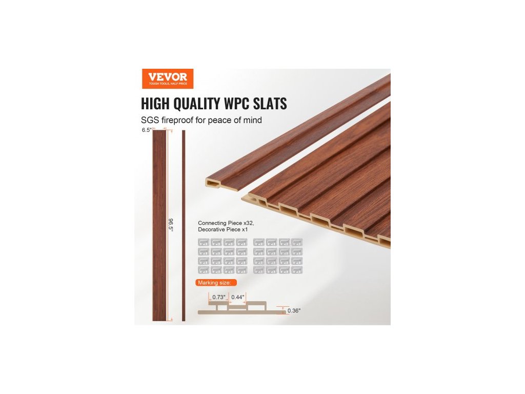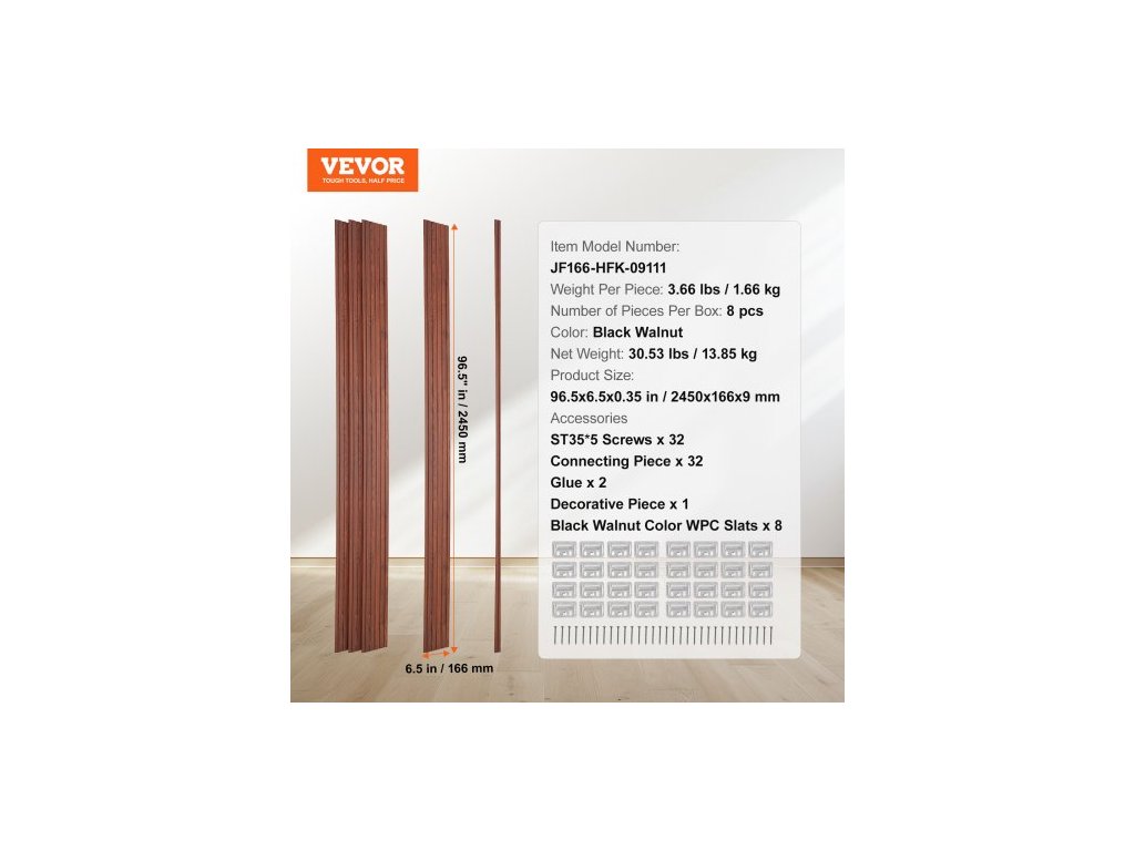 Počet kusů v krabici: 8 ks,Hmotnost na kus: 3,66 lbs / 1,66 kg,Barva: černý ořech,Číslo modelu položky: JF166-HFK-09111,Čistá hmotnost: 30,53 lbs / 13,85 kg,Rozměry produktu: 96,5x6,5x0,35 palce / 2450x166x9 mm