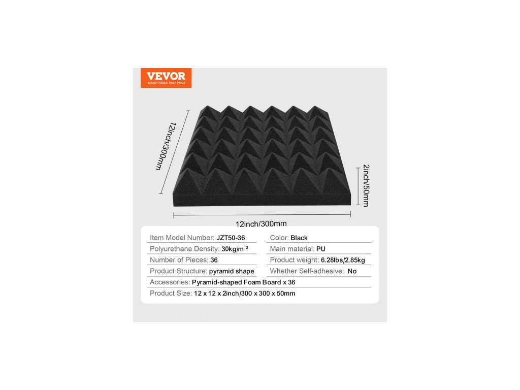 Struktura produktu: pyramidový tvar, Samolepicí: Ne, Hustota polyuretanu: 30 kg/m3, Počet kusů: 36, Číslo modelu položky: JZT50-36, Hmotnost produktu: 6,28 liber/2,85 kg, Rozměry produktu: 12 x 12 x 2 palce/300 x 300 x 50 mm