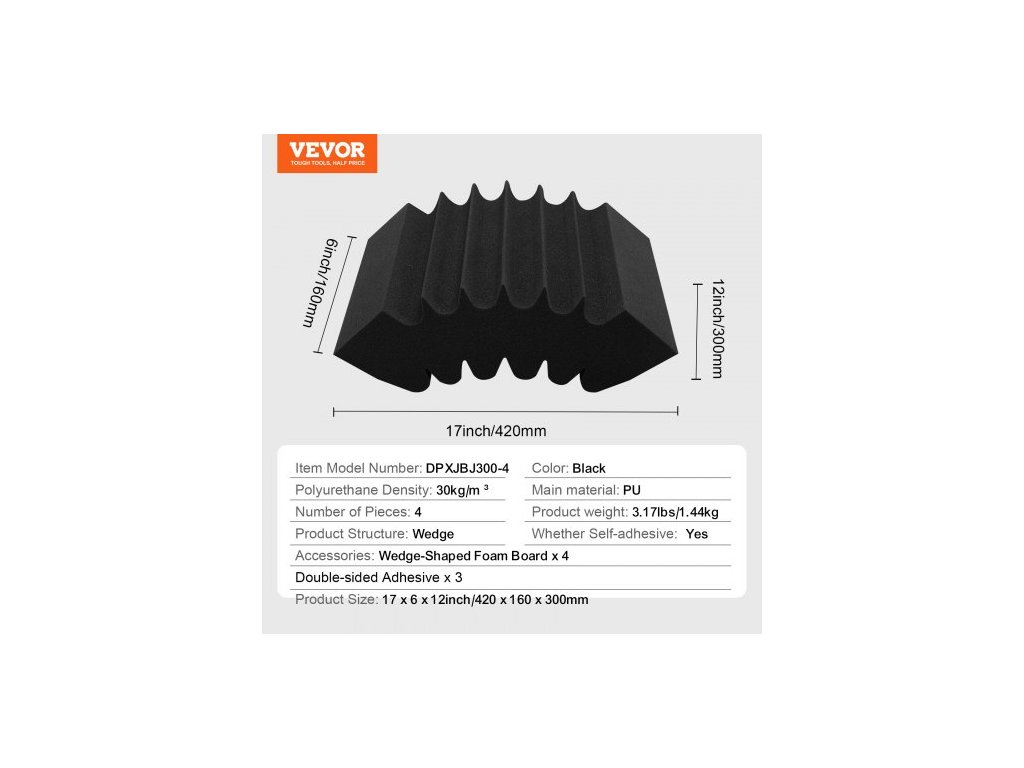 Konstrukce produktu: klín, Hustota polyuretanu: 30 kg/m3, Počet kusů: 4, Číslo modelu položky: DPXJBJ300-4, Hmotnost produktu: 3,17 lbs/1,44 kg, Samolepicí: Ano, Rozměry produktu: 17 x 6 x 12 palců/420 x 160 x 300 mm