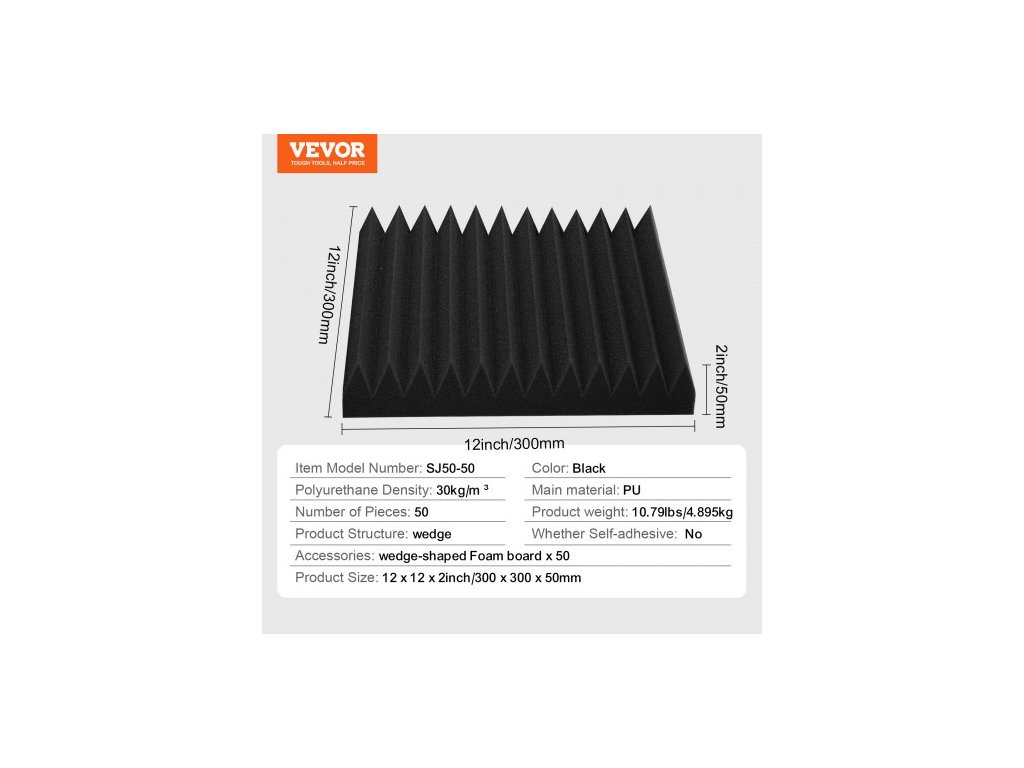 Konstrukce produktu: klín, Hustota polyuretanu: 30 kg/m3, Počet kusů: 50, Číslo modelu položky: SJ50-50, Hmotnost produktu: 10,79 liber/4,895 kg, Samolepicí: Ne, Velikost produktu: 12 x 12 x 2 palce/300 x 300 x 50 mm