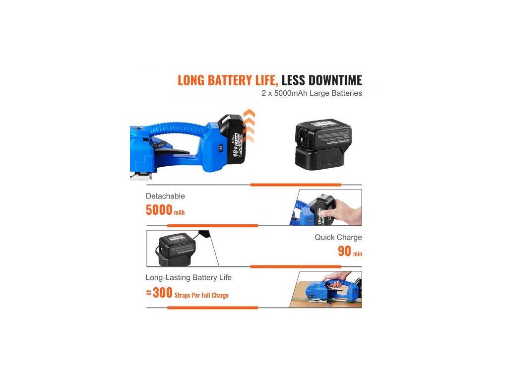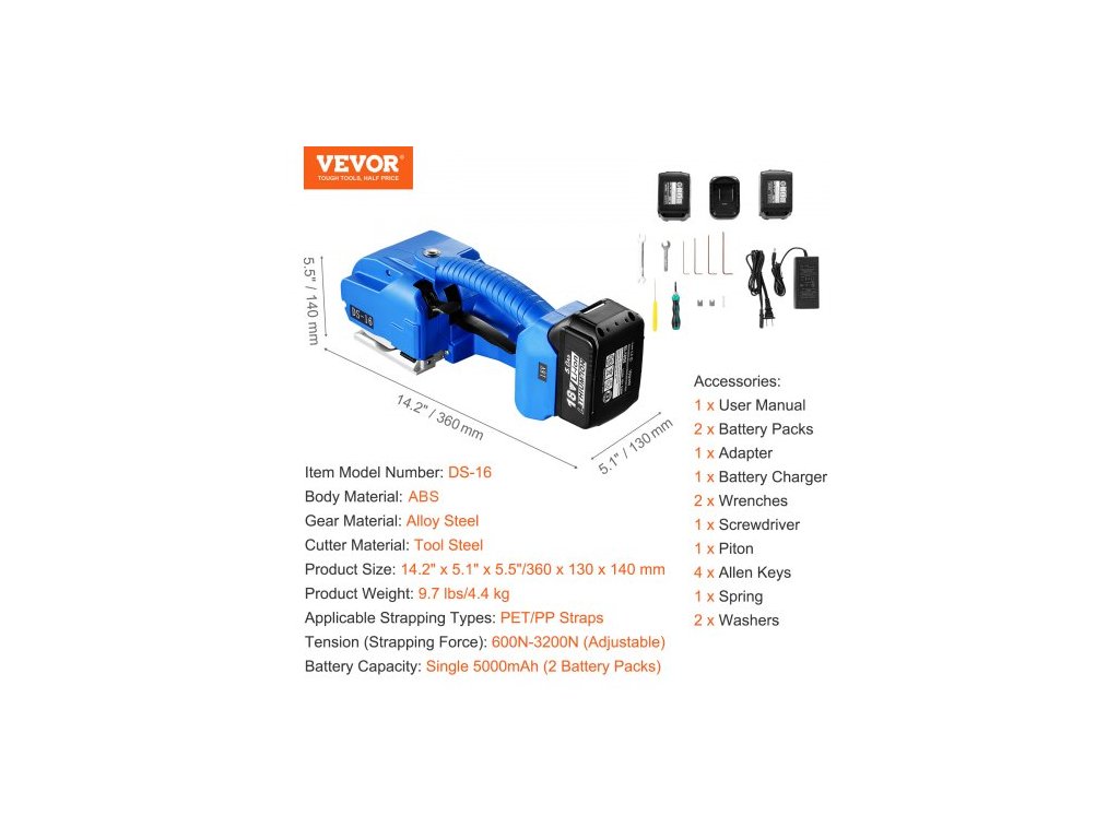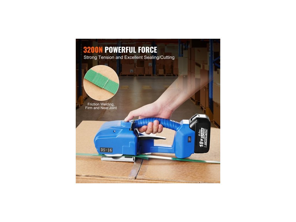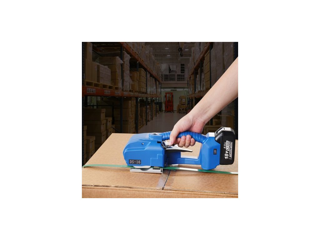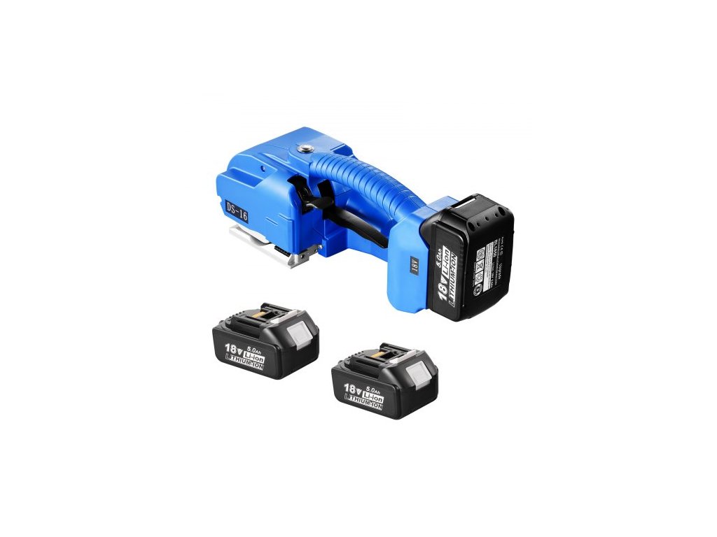 Materiál těla: ABS,Kapacita baterie: Jedna 5000 mAh (2 baterie),Napětí (síla páskování): 600 N–3200 N (nastavitelné),Číslo modelu: DS-16,Hmotnost výrobku: 4,4 kg,Materiál řezacího nástroje: Nástrojová ocel,Materiál ozubeného kola: Legovaná ocel,Rozměry výrobku: 360 x 130 x 140 mm,Použitelné typy páskování: PET/PP pásky