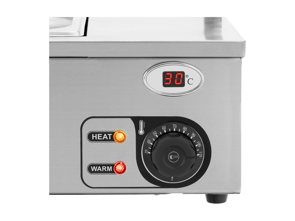 Efektivní 2100 W výkonné topné těleso rychle ohřeje vodní lázeň na požadovanou teplotu. Ovládací kolečko aktivuje automatický termostat, který umožňuje přesnou regulaci teploty v rozmezí 30 - 110. °C. Pro nekomplikované použití je ohřívač potravin vybaven vypouštěcím kohoutkem.