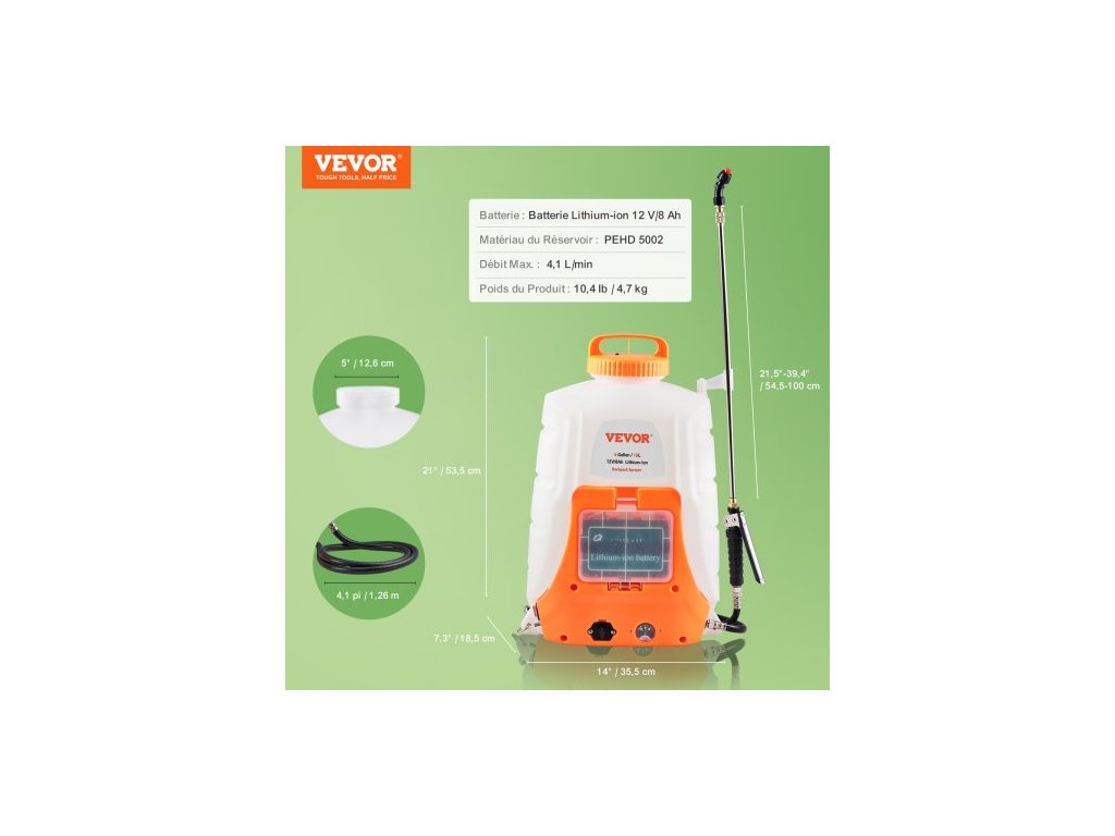 Max. průtok: 4,1 l/min,Baterie: 12V/8Ah Lithium-iontová,Hmotnost výrobku: 11,5 kg / 25,3 lbs,Materiál: HDPE 5002,Rozměry výrobku: 14" x 7,3" x 21" / 35,5 x 18,5 x 53,5 cm,Tlak: 0-90 PSI