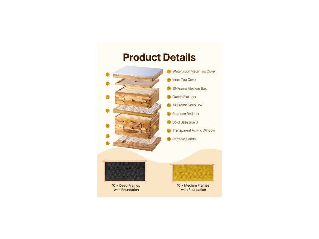 Bee Hive - 20rámková startovací sada pro včelí úly, jedlové dřevo s včelím voskem, 1 hluboká + 1 střední budka pro včely, sada pro včelí úly Langstroth, průhledná akrylová okénka se základy pro začínající včelaře.