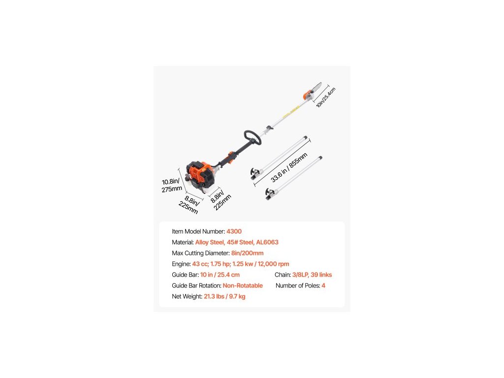 Počet dílů tyče: 4,Objem nádrže na olej na řetěz: 150 ml,Řetěz: 3/8LP, 39 článků,Otáčení vodicí lišty: Neotočné,Maximální průměr řezu: 200 mm,Materiál prodlužovací tyče: AL6063,Tloušťka prodlužovací tyče: 2 mm,Materiál řetězu: Legovaná ocel,Otáčky motoru: 1,25 kW/8 500 ot/min; Max. 12 000 ot./min, Číslo modelu položky: 4300, Objem palivové nádrže: 30 fl. oz. / 850 ml,Rozměry produktu (D x Š x V): 10,8 × 8,9 × 8,9 palce / 275 × 225 × 225 mm,Tloušťka olejové tyče: 0,08 palce / 2 mm,Délka produktu (bez prodlužovací tyče): 6,9 stop / 2,11 m,Zdvih motoru: 2taktní,Délka produktu (s prodlužovací tyčí): 11,8 stop / 3,61 m,Rozměry olejové tyče (D x Š x V): 33,7 × 4,7 × 2,8 palce / 855 × 120 × 70 mm,Zdvihový objem: 43 cm3,Specifikace řetězu: 3/8LP, 39 článků,Prodlužovací tyče: 2,Rozměry prodlužovací tyče (D x Š x V): 33,7 × 6,1 × 2,8 palce / 855 × 155 × 70 mm,Délka vodicí lišty: 10 palců / 25,4 cm, Čistá hmotnost: 9,7 kg, Výkon: 1,75 HP, Materiál olejové tyče: AL6063, Materiál vodicí lišty: Ocel 45#