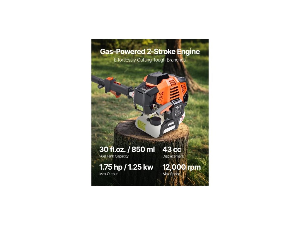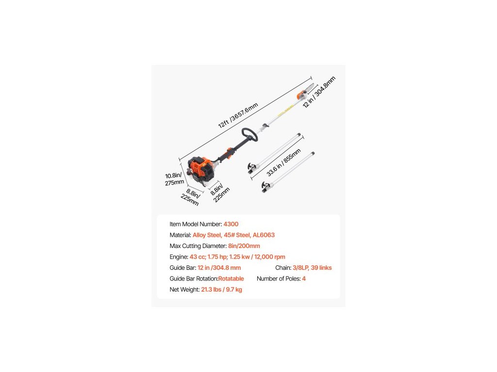 Počet dílů tyče: 4,Objem nádrže na olej na řetěz: 150 ml,Řetěz: 3/8LP, 39 článků,Otáčení vodicí lišty: Otočná,Maximální průměr řezu: 200 mm,Materiál prodlužovací tyče: AL6063,Tloušťka prodlužovací tyče: 2 mm,Materiál řetězu: Legovaná ocel,Otáčky motoru: 1,25 kW/8 500 ot/min; Max. 12 000 ot./min, Číslo modelu položky: 4300, Objem palivové nádrže: 30 fl. oz. / 850 ml,Rozměry produktu (D x Š x V): 10,8 × 8,9 × 8,9 palce / 275 × 225 × 225 mm,Tloušťka olejové tyče: 0,08 palce / 2 mm,Délka produktu (bez prodlužovací tyče): 7,1 stop / 2,16 m,Zdvih motoru: 2taktní,Délka produktu (s prodlužovací tyčí): 12 stop / 3,66 m,Rozměry olejové tyče (D x Š x V): 33,7 × 4,7 × 2,8 palce / 855 × 120 × 70 mm,Zdvihový objem: 43 cm3,Specifikace řetězu: 3/8LP, 39 článků,Prodlužovací tyče: 2,Rozměry prodlužovací tyče (D x Š x V): 33,7 × 6,1 × 2,8 palce / 855 × 155 × 70 mm,Délka vodicí lišty: 12 palců,Čistá hmotnost: 21,3 9,7 kg, Výkon: 1,75 HP, Materiál olejové tyče: AL6063, Materiál vodicí lišty: Ocel 45#