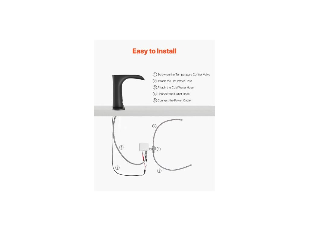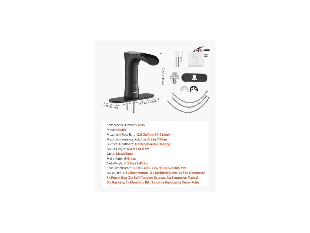 Velikost hadicové přípojky: 3/8 palce / 9,5 mm, výška výtoku: 5,3 palce / 13,5 cm, délka hadice: 19,7 palce / 500 mm, snímací vzdálenost: až 6,3 palce / 16 cm, barva: matná černá, číslo modelu položky: G235, maximální průtok: 2,0 GPM / 7,6 l/min, povrchová úprava: elektroforetický povlak, rozměry položky: 6,3 x 2,4 x 5,7 palce / 160 x 62 x 145 mm, Čistá hmotnost: 3,2 lbs / 1,45 kg, Hlavní materiál: Mosaz, Napájení: DC 6V (4 x AA alkalické baterie, nejsou součástí balení)