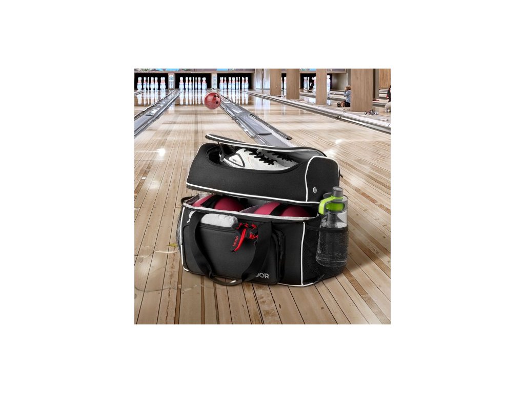 Bowlingová taška na koule , bowlingová taška na 2 koule a čtyři válečky s kolečky, se samostatnou přihrádkou na boty (až do velikosti US 16) a velkou kapsou na příslušenství, zatahovací rukojeť s délkou až 950 mm