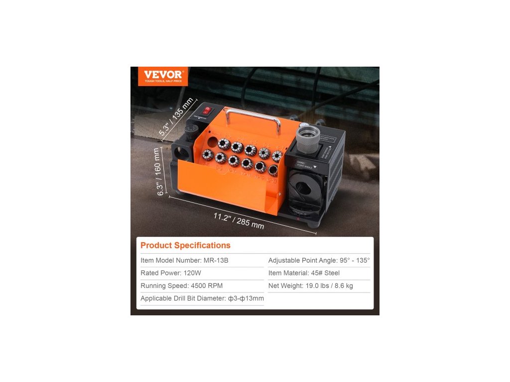 Použitelný průměr vrtáku: 3-13 mm,Materiál výrobku: Ocel 45#,Nastavitelný úhel špičky: 95° - 135°,Otáčky: 4500 ot./min,Číslo modelu výrobku: MR-13B,Jmenovitý výkon: 120 W,Rozměry výrobku: 285 x 135 x 160 mm,Čistá hmotnost: 8,6 kg