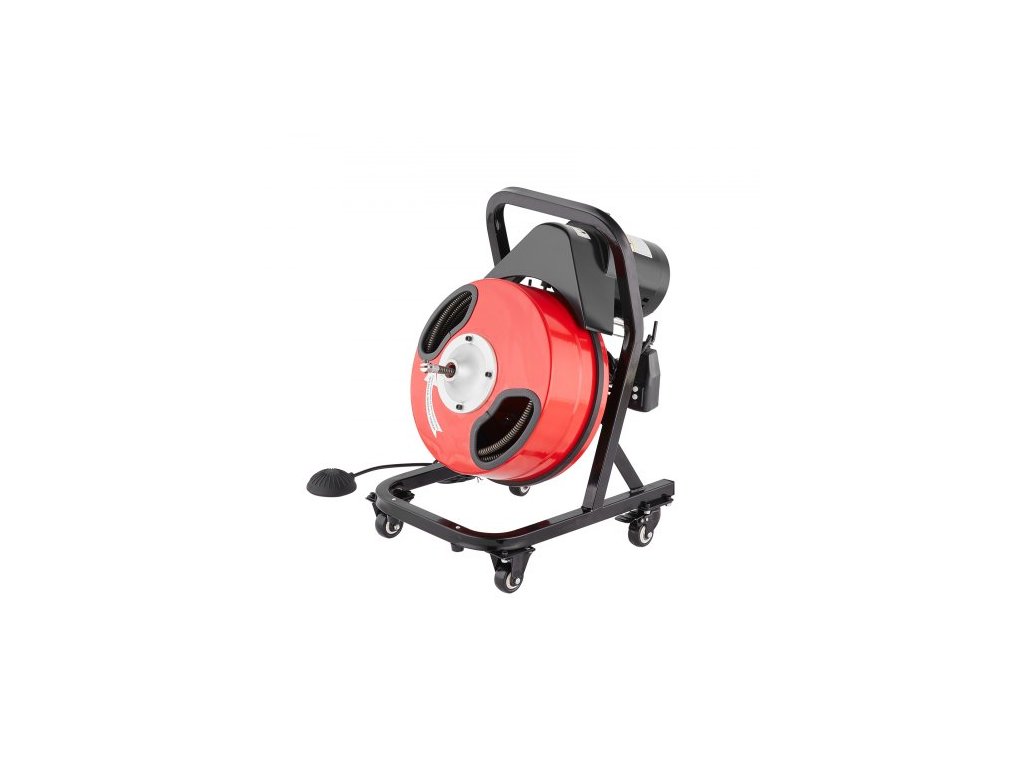 Čistič odpadů 15,2 m x 1,2 cm, ruční podávání kanalizačního šneku - s kolečky, 4 řeznými zuby a vzduchem aktivovaným nožním spínačem pro potrubí od 2" do 4"