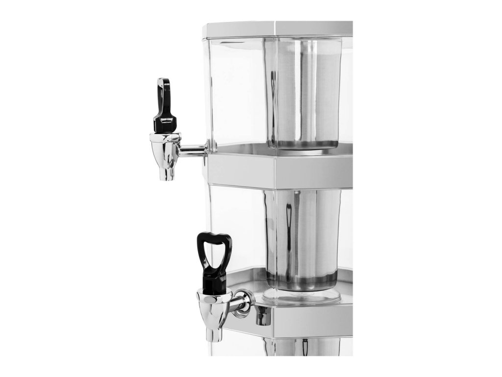 Celý dávkovač na nápoje se skládá z odolných a chuťově neutrálních materiálů. Osmiúhelníkové zásobníky o průměru 23,5 cm do sebe perfektně zapadají, proto je lze stabilně naskládat na lesklý stojan z ušlechtilé oceli. Robustní a průhledný plast umožňuje hostům vždy přesně vidět, jaký nápoj se podává, a Vy jako hostitel naopak uvidíte, kdy je potřeba obsah doplnit. To je mimochodem velmi snadné – zvedněte víko a můžete dolít tekutinu bez toho, aniž by něco stříkalo okolo. Kromě toho je materiál nádob velmi odolný vůči poškrábání a snadno se čistí.