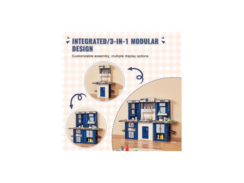 Barva: Modrá, Číslo modelu položky: 1234-7D, Hmotnost výrobku: 7 kg, Styl: Modulární designová herní kuchyňka 3 v 1, Realistické kuchyňské nádobí a jídlo: 74 dílů, Materiál: PP, Specifikace baterií: 6 x AA baterie (nejsou součástí balení), Rozměry výrobku: 128 x 29 x 90 cm
