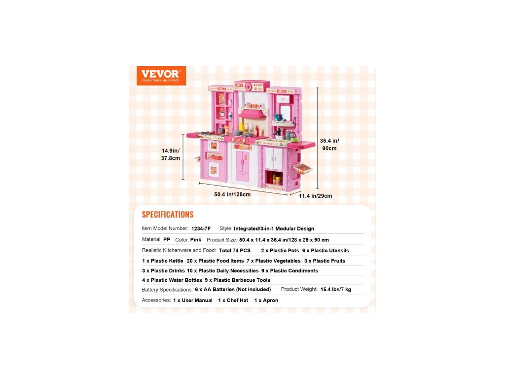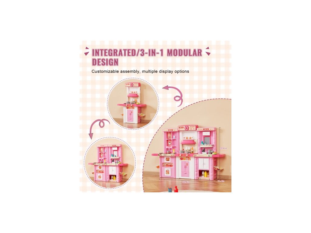 Barva: růžová, Číslo modelu: 1234-7F, Hmotnost výrobku: 7 kg, Styl: Modulární design 3v1 kuchyňky, Realistické kuchyňské nádobí a jídlo: 74 dílů, Materiál: PP, Specifikace baterií: 6 x AA baterie (nejsou součástí balení), Rozměry výrobku: 128 x 29 x 90 cm