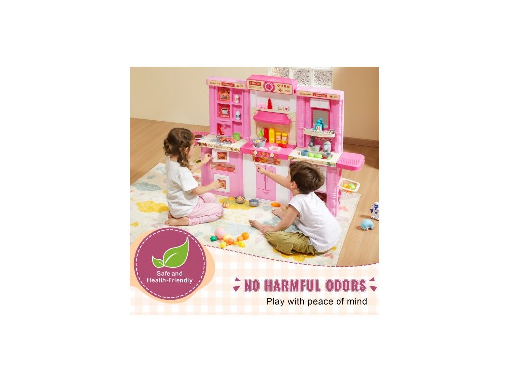 Dětská kuchyňská sada, 3v1 dětská kuchyňka se simulovaným postřikem, zvuky a světly, sada kuchyňky na hraní se 74 díly kuchyňského příslušenství pro batolata, předškoláky, děti ve věku 3-8 let, růžová