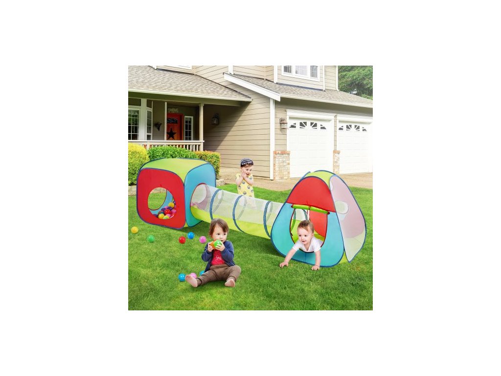 3 v 1 dětský herní stan s tunelem pro chlapce, dívky, miminka a batolata, vnitřní/venkovní rozkládací domeček s přepravní taškou a popruhy jako dárek k narozeninám, červeno-žluto-modrý vícebarevný