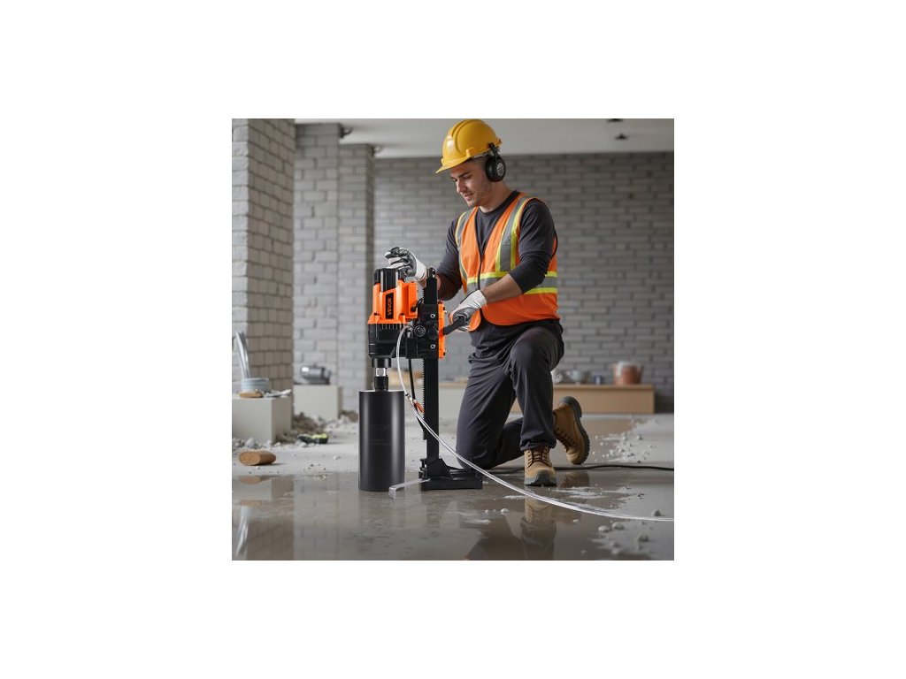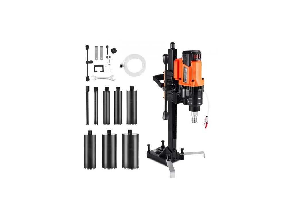 Diamantová jádrová vrtačka , průměr vrtání 20–200 mm, stojan pro suché i mokré jádrové vrtání do betonu s 8 vrtáky, otáčky 850 ot./min, závit UNC1 1/4–7, pro beton, cihly, kámen, 3000 W