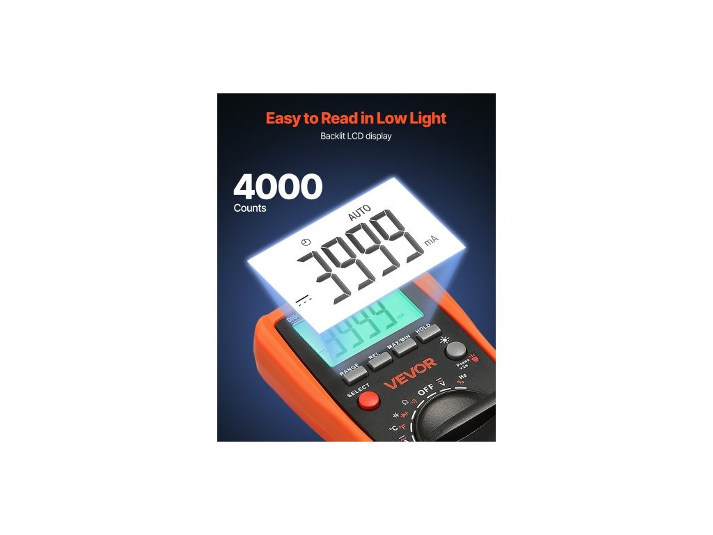 Digitální multimetr , 4000bodový TRMS DC/AC voltmetr, tester proudu, automatický multimetr pro měření proudu, napětí, odporu, kapacity, teploty, diod, vodivosti, střídy a pracovního cyklu.