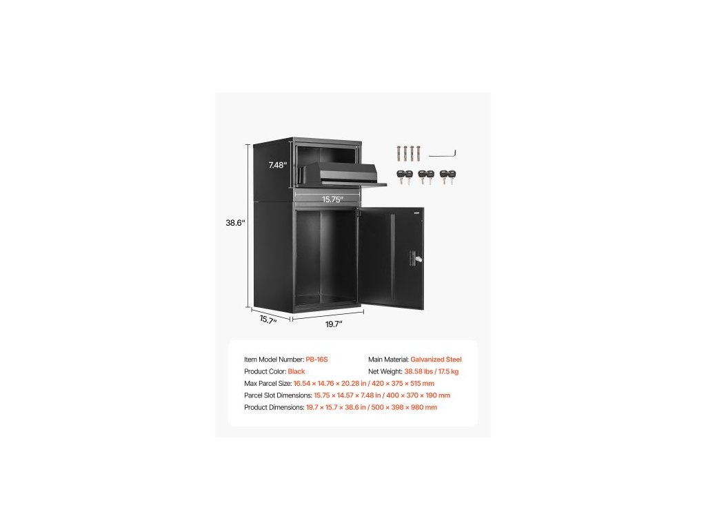 Doručovací krabice do exteriéru, poštovní schránka na balíky 38,6 palce se zámkem, pozinkovaná ocelová schránka na balíky s ochranou proti krádeži, poštovní schránka na balíky odolná vůči povětrnostním vlivům pro domácnosti a kanceláře, černý pozinkovaný plech, čtvercové magnety, magnetické dveře, víceúčelové použití, dlouhotrvající a odolné, k dispozici více specifikací, úložná kapacita balíků: 16,54 x 14,76 x 20,28 palce / 420 x 375 x 515 mm, barva: černá, číslo modelu položky: PB-16S, rozměry produktu: 19,7 x 15,7 x 38,6 palce / 500 x 398 x 980 mm, rozměry přihrádky na balíky: 15,75 x 14,57 x 7,48 palce / 400 x 370 x 190 mm, Čistá hmotnost: 38,58 lbs / 17,5 kg, Hlavní materiál: Pozinkovaná ocel