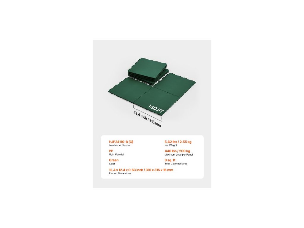 Celková plocha pokrytí: 8 čtverečních stop,Barva: Zelená,Číslo modelu položky: HJP24110-8,Maximální zatížení na panel: 440 liber / 200 kg,Množství: 8 ks,Rozměry produktu: 12,4 x 12,4 x 0,63 palce / 315 x 315 x 16 mm,Čistá hmotnost: 5,73 liber / 2,6 kg,Hlavní materiál: PP