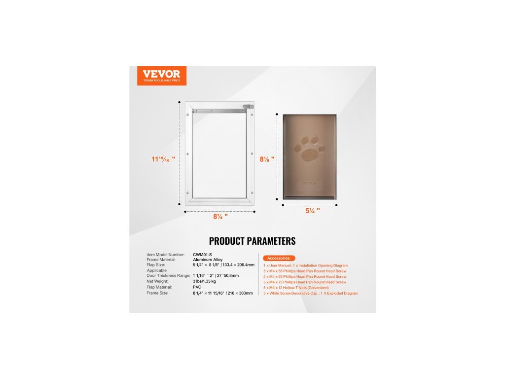 Použitelný rozsah tloušťky dvířek: 1,06-2 palce / 27-50,8 mm,Velikost klapky: 5,25 x 8,13 palce / 133,4 x 206,4 mm,Číslo modelu položky: CWM01-S,Materiál klapky: PVC,Materiál rámu: Hliníková slitina,Čistá hmotnost: 3 lbs/1,35 kg,Velikost rámu: 8,27 x 11,93 palce / 210 x 303 mm