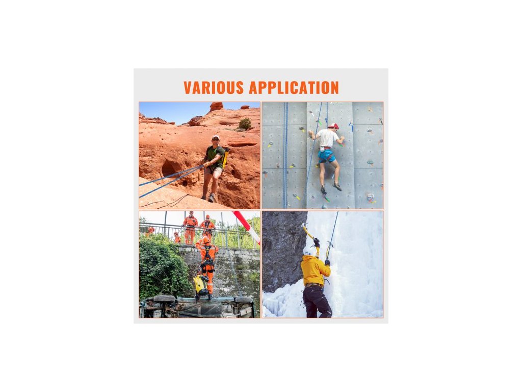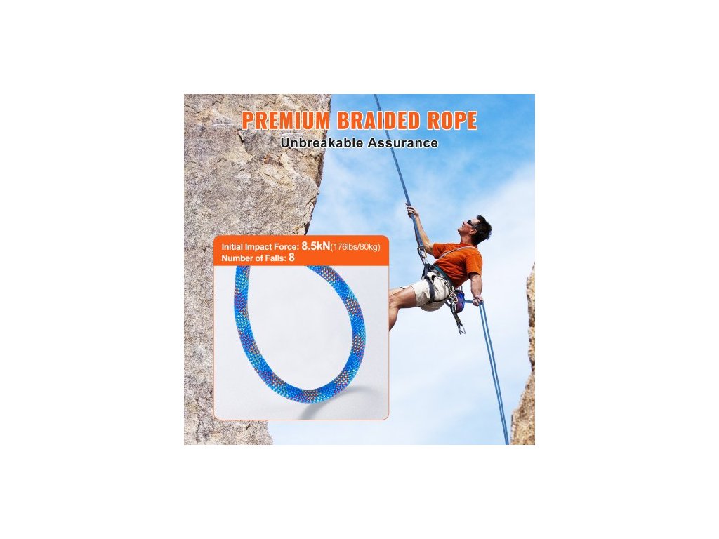 Dynamické lezecké lano 10,2 mm, 50 m (164 stop), venkovní lezecké lano, mezní napětí 25 kN, roztažitelné vláknité lano s ocelovými karabinami pro únik, slaňování a hasičskou záchranu, modré