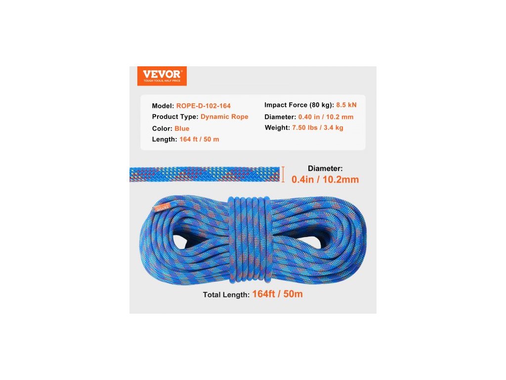 Typ produktu: Dynamické lano,Délka: 164 stop / 50 m,Rázová síla (80 kg): 8,5 kN,Barva: Modrá,Model: ROPE-D-102-164,Průměr: 10,2 mm / 0,40 palce,Hmotnost: 7,50 liber / 3,4 kg
