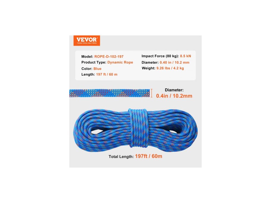 Typ produktu: Dynamické lano,Délka: 197 stop / 60 m,Rázová síla (80 kg): 8,5 kN,Barva: Modrá,Model: ROPE-D-102-197,Hmotnost: 4,2 lbs / 9,26 kg