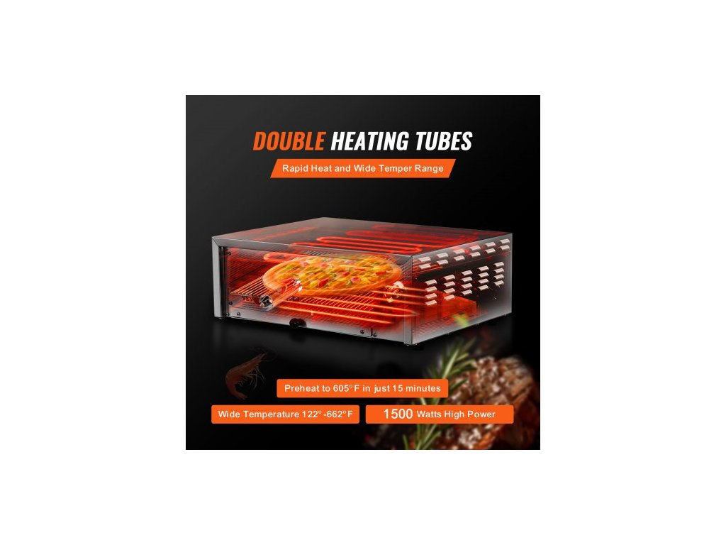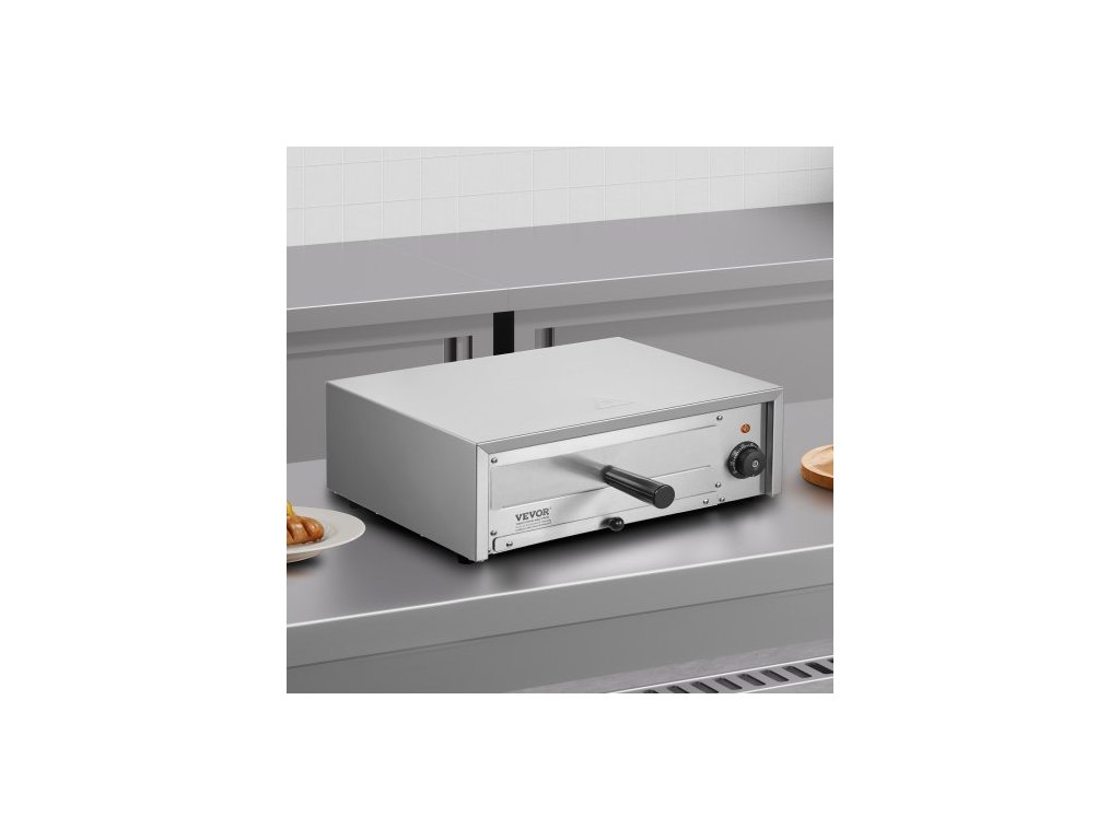 Elektrická pec na pizzu , stolní, 12 palců, 1500 W, teplotní rozsah 0–300 °C, konstrukce z nerezové oceli a snadno čistitelný plech na drobky, vhodná pro komerční i domácí použití.