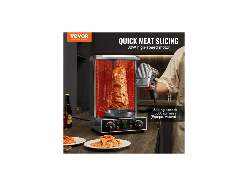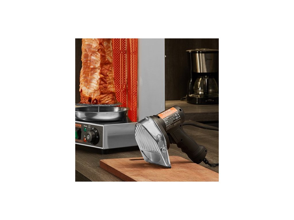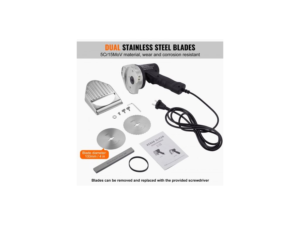 Elektrický nůž Shawarma, profesionální nůž na turecký kebab 80 W, komerční gyro řezačka z nerezové oceli, kráječ masa na döner kebab se 2 čepelemi, průměr čepele ?4"/100 mm, nastavitelná tloušťka 0-8 mm