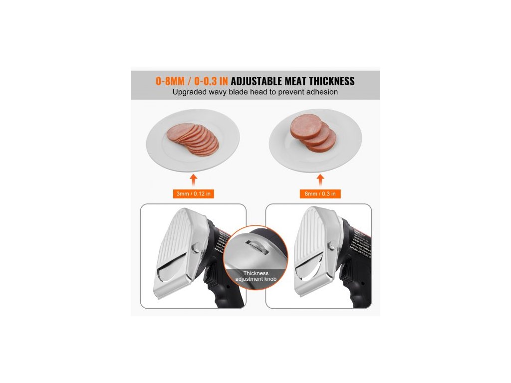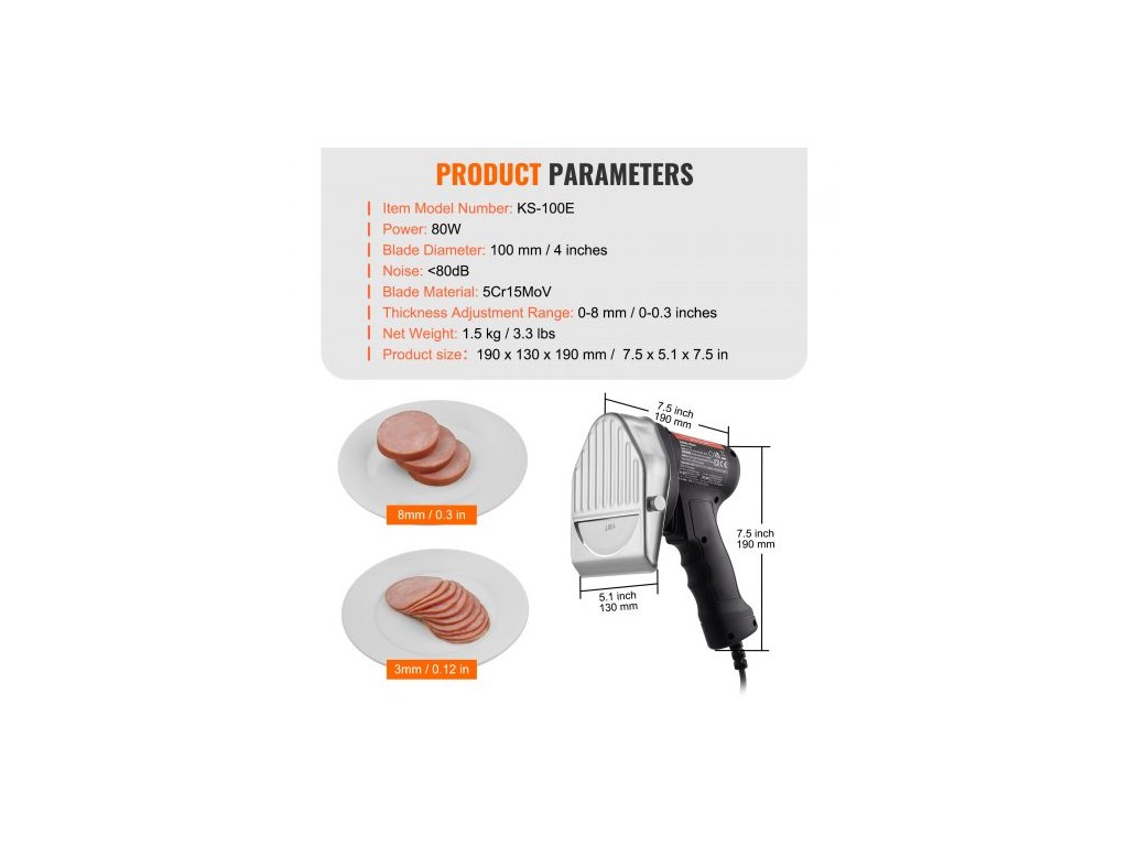 Průměr čepele: 100 mm / 4 palce,Materiál čepele: 5Cr15mov,Hlučnost: <80 dB,Rozměry: 190 x 130 x 190 mm / 7,5 x 5,1 x 7,5 palce,Rozsah nastavení tloušťky: 0-8 mm / 0-0,3 palce,Číslo modelu: KS-100E,Čistá hmotnost: 1,5 kg / 3,3 lbs,Příkon: 80 W